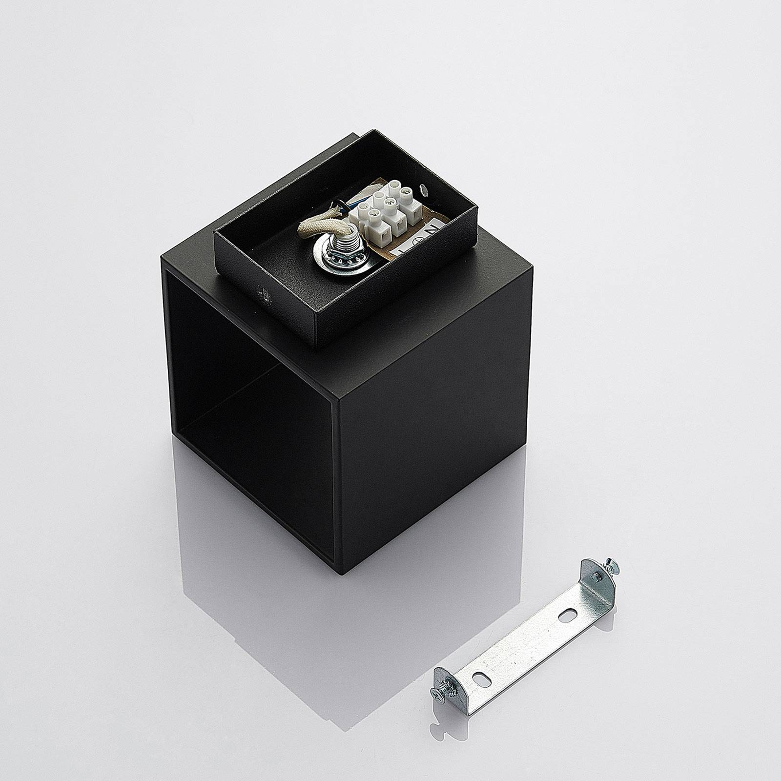 Applique Mirza squadrata di alluminio nero, per lampadina G9 La superficie di questa lampada presenta una finitura nera, neutra ed elegante, che si intona a molti tipi di arredamenti. Ad esempio fa bella figura in abbinamento a uno stile moderno e lineare. Vi si avvita una lampadina ad attacco GU9, preferibilmente in moderna ed efficiente tecnica LED. La luce si proietta in alto e in basso diffondendo un'illuminazione accogliente, adatta in salotto, in camera da letto o in corridoio.