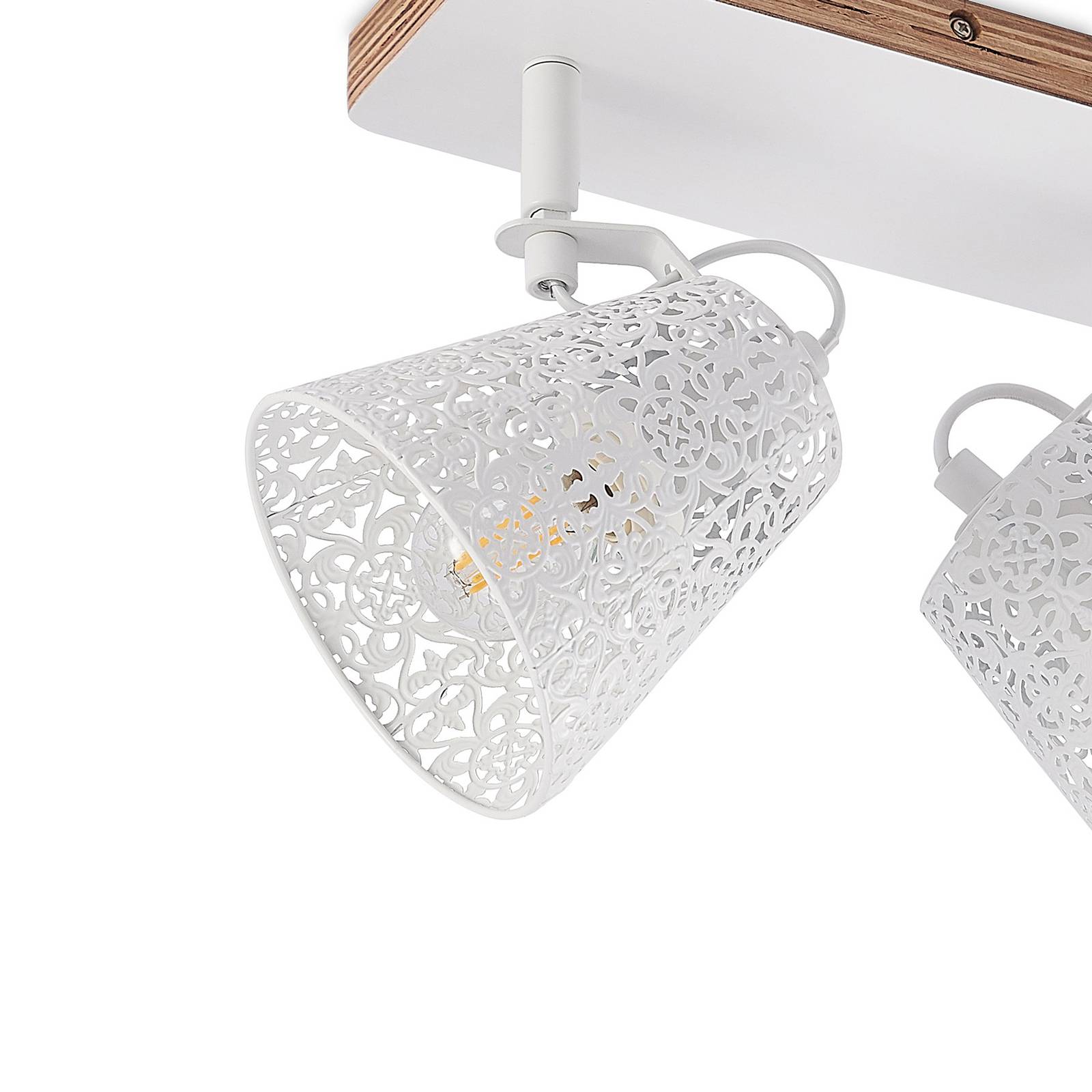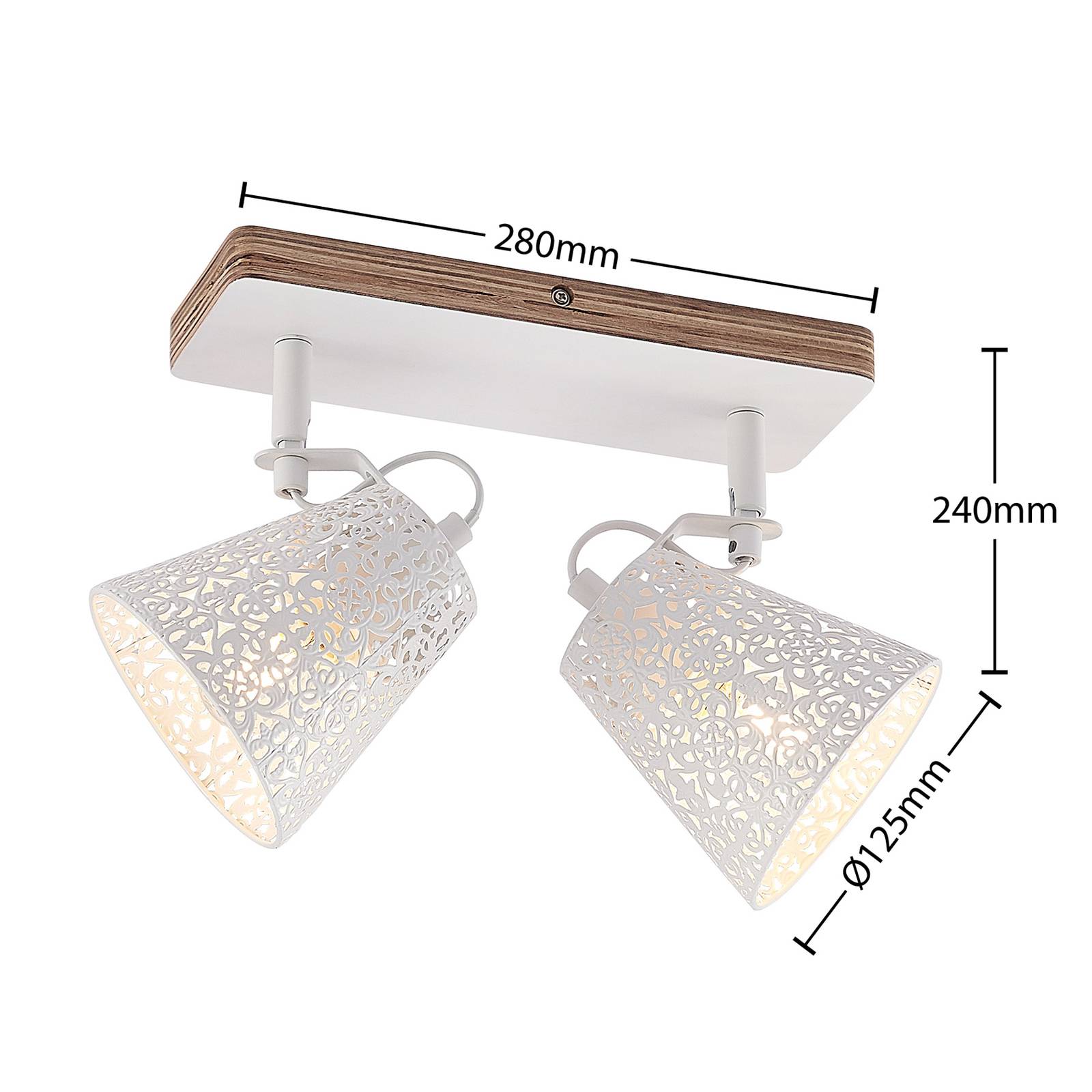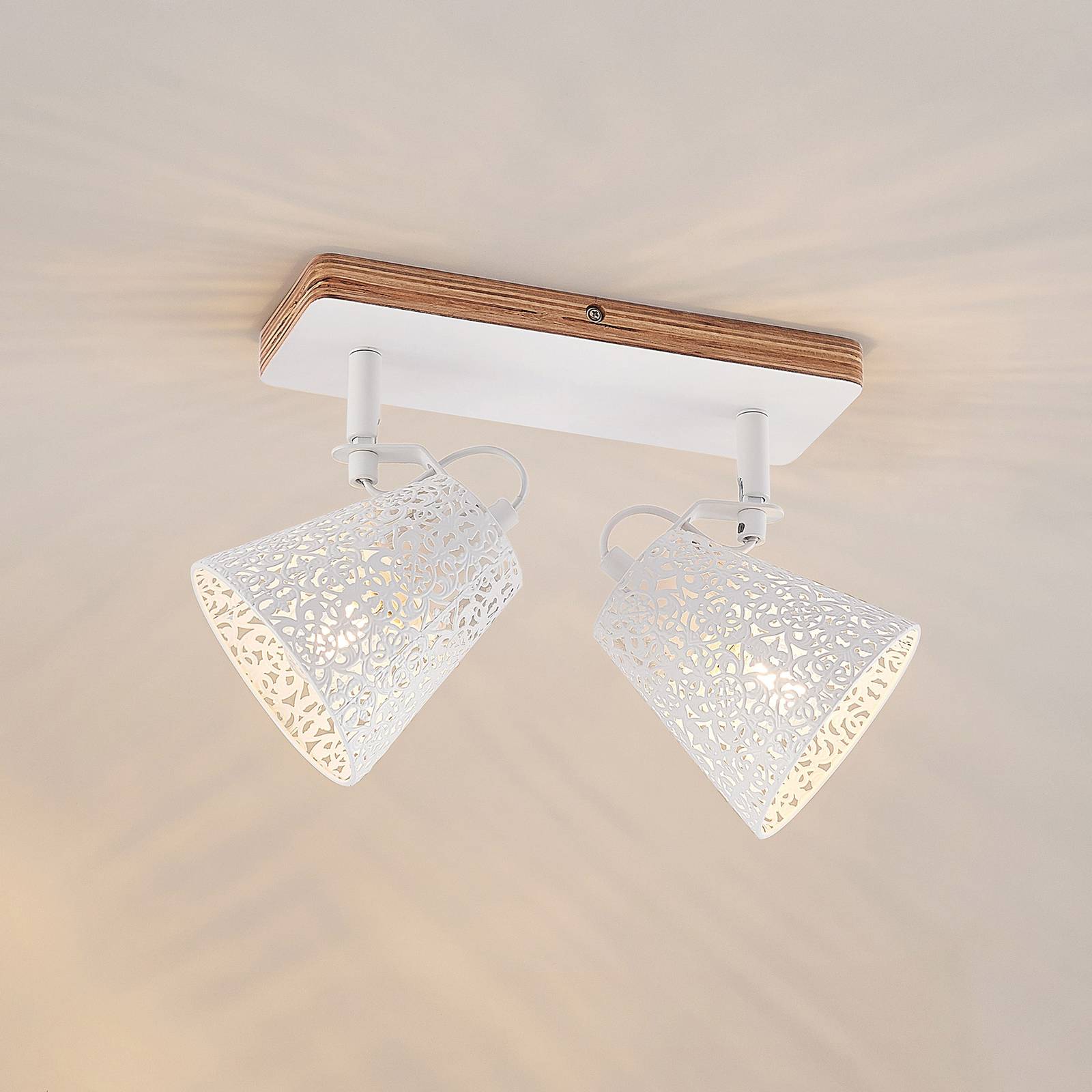 Faretto a due lampade Nelda con paralumi in metallo dal design artistico in bianco Un motivo traforato con punzonature artistiche domina l'aspetto di questo faretto, che può essere splendidamente montato a soffitto, ma all'occorrenza anche a parete. I due paralumi metallici in acciaio possono essere ruotati e orientati e non sono disegnati in modo continuo, ma presentano un elegante motivo a punzonatura che si adatta bene anche agli stili orientali o completa splendidamente gli interni romantici delle case di campagna. La superficie bianca dei paralumi diffonde un'aura armoniosa e l'elemento in compensato si abbina perfettamente e sottolinea l'aspetto generale in modo elegante. Quando si accendono le sorgenti luminose, il motivo traforato crea in un attimo bellissimi disegni sulla parete e sul soffitto, che non solo risultano eleganti e accoglienti in soggiorno, ma anche in un corridoio o in camera da letto