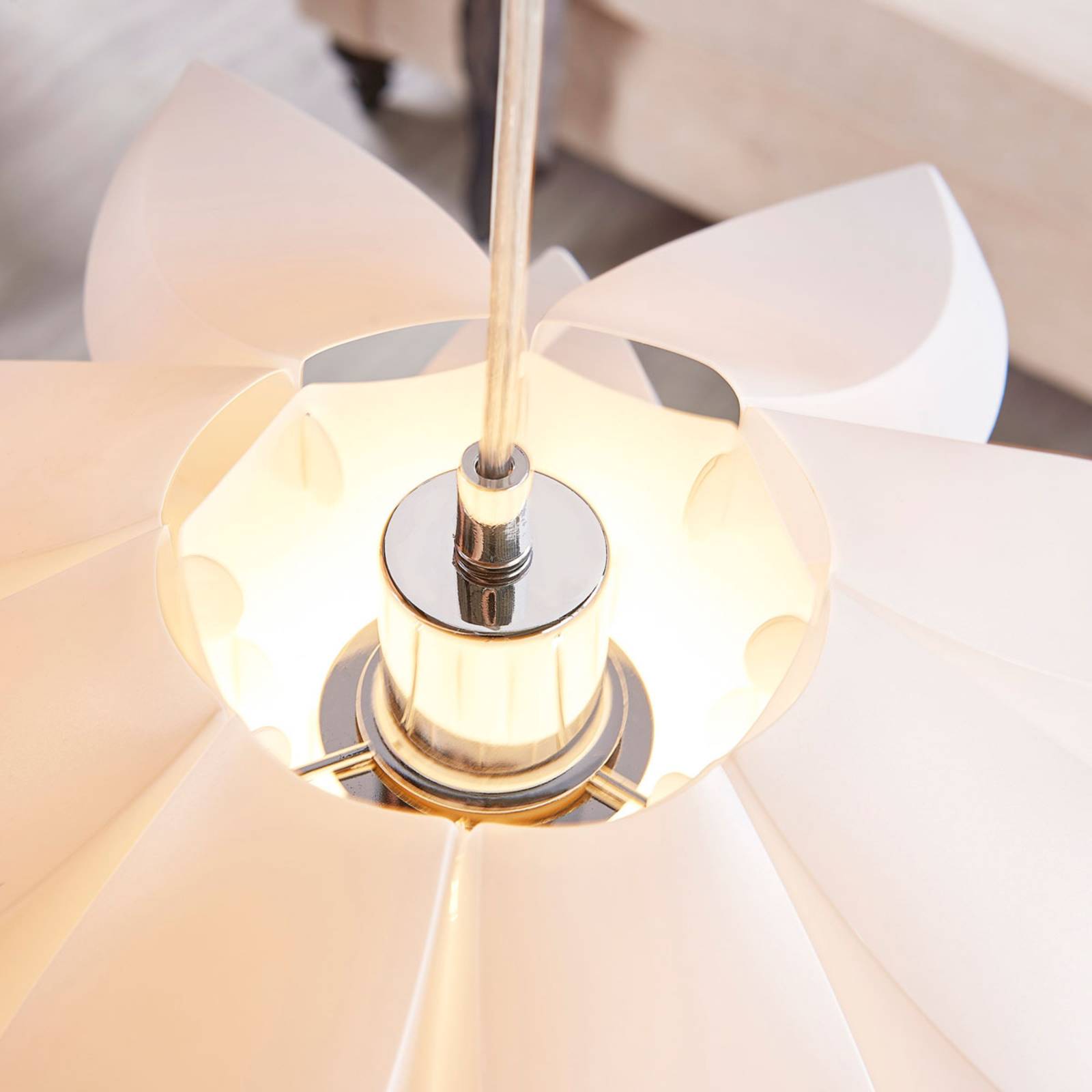 Lampada a sospensione Rimon di bella forma Rimon è una lampada adatta per un ambiente arredato in stile scandinavo o in stile giovanile. Il paralume è composto da diversi elementi di plastica bianchi, assemblati a ventaglio in modo da sembrare un insieme di piante o fiori. Grazie alla superficie bianca e al differente grado di trasparenza, la luce prodotta da questa lampada a sospensione crea un'atmosfera invitante con effetti incantevoli. Una lampada di classe di una bellezza senza tempo!