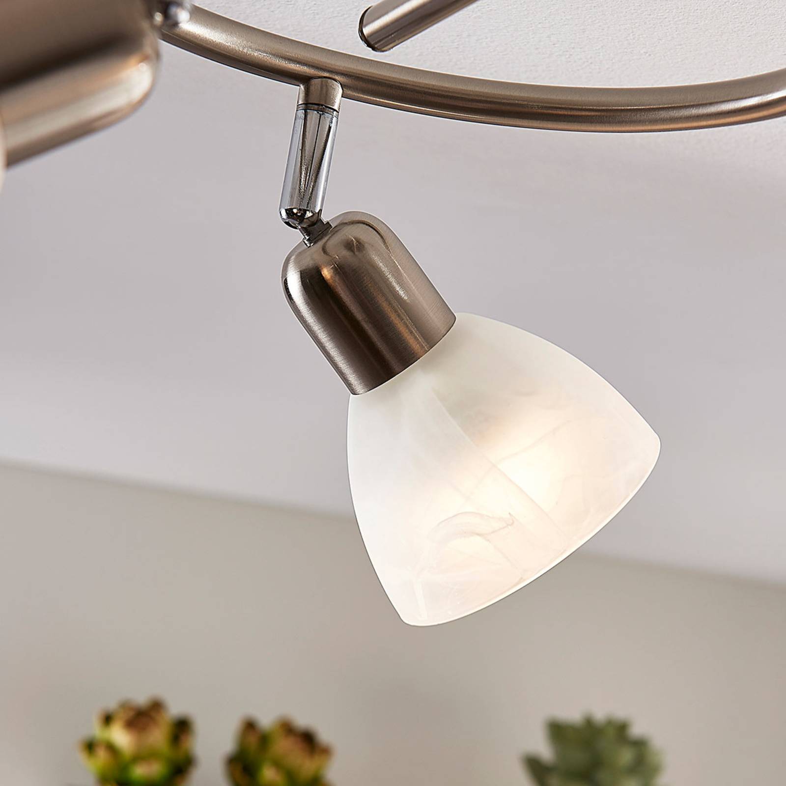 Bellissimo tondo da soffitto Paulina con paralumi in vetro regolabili Paulina è un tondo da soffitto dall'uso versatile. Può essere installato in salotti di ogni tipo ed è relativamente indipendente in termini di stile. Visivamente, combina paralumi in vetro bianco con una tonalità alabastro e una cornice color nichel: una fonte di luce piacevolmente senza tempo. I paralumi sono fissati al telaio con giunti e possono quindi essere non solo ruotati ma anche orientati. Grazie a questa caratteristica, lo schema luminoso può essere facilmente adattato alle esigenze individuali. L'apparecchio può essere dotato di lampadine E14