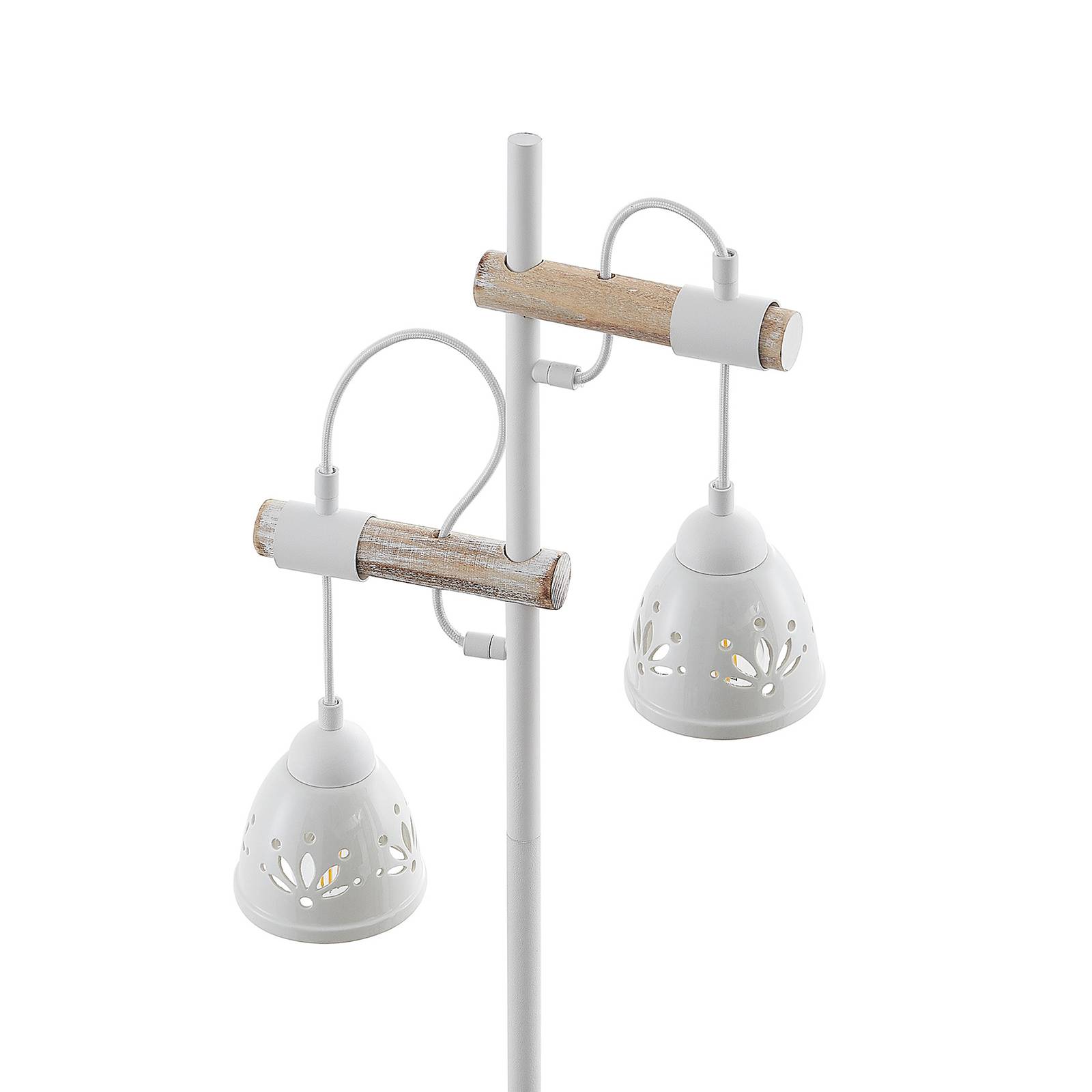 Lampada da terra design-oriented Pimana con due paralumi in ceramica bianca Pimana è una bella lampada da terra con un design speciale. Ha una base rotonda in acciaio che gli dà la stabilità necessaria. Due travi orizzontali sono attaccate a un semplice telaio, che sono coperte da una calda decorazione in legno. I due paralumi pendono da questi ed emettono la loro luce verso il basso. Le tonalità sono fatte di ceramica bianca e hanno ritagli floreali che creano interessanti accenti di luce nella stanza. Questa lampada porta intimità ed eleganza nel soggiorno e può essere azionata comodamente con un interruttore a pedale.