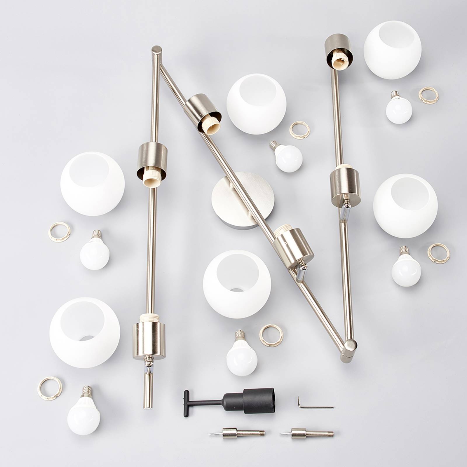 Lampada da soffitto Elaina color nichel Con la sua struttura color nichel e i vetri opalini bianchi, Elaina è una fonte di luce senza tempo. La struttura è dotata di tre bracci lampada, di cui i due bracci esterni possono essere allineati individualmente prima di essere fissati in posizione. Soprattutto per chi cerca una lampada da soffitto in grado di illuminare bene anche gli ambienti più grandi, Elaina è una buona alternativa perché ha un totale di sei fiamme e si estende per una lunghezza di 180 cm quando è montata in linea retta
