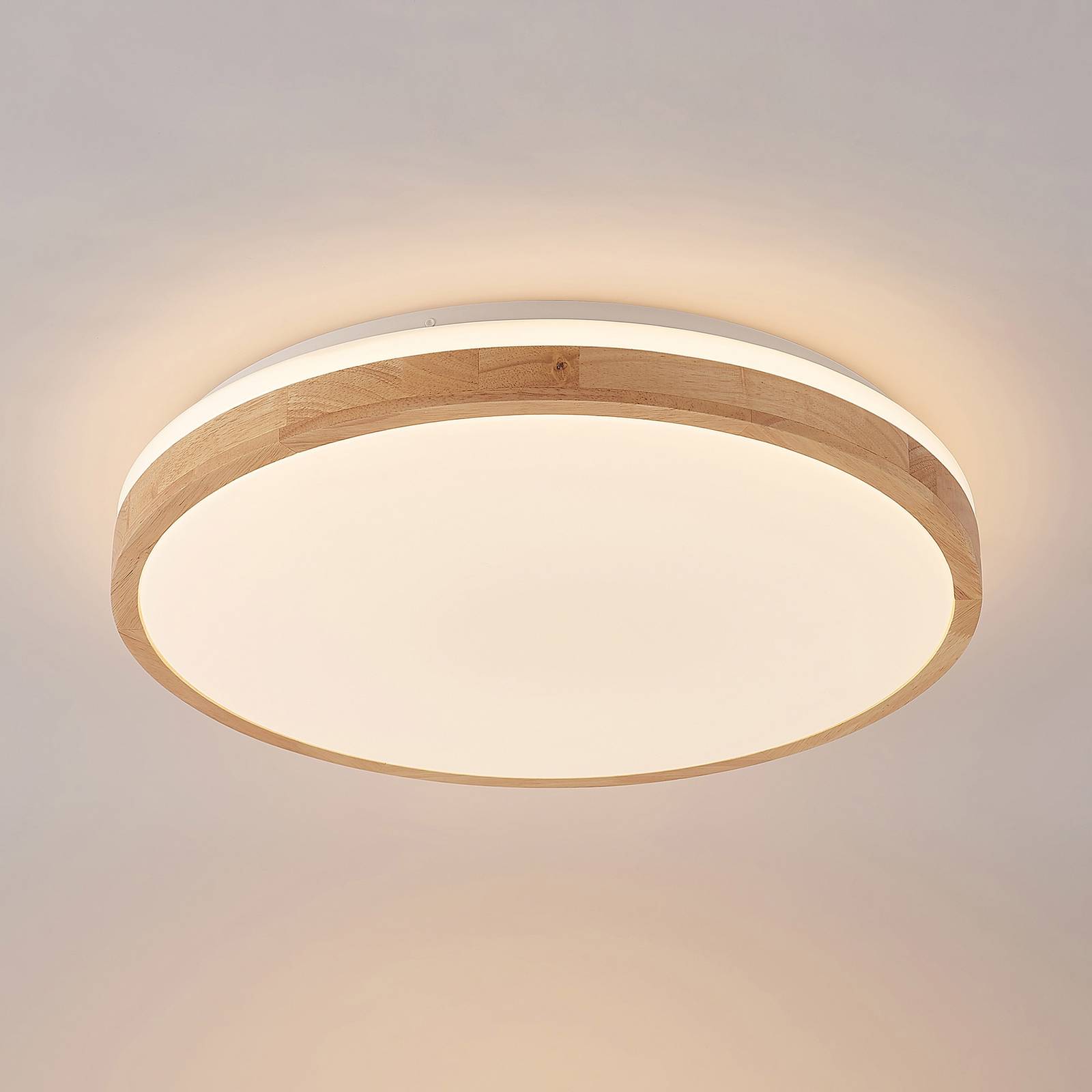 Plafoniera in legno Emiva LED dimmerabile all'infinito con telecomando La plafoniera Emiva LED colpisce per il suo design semplice, che si integra bene nell'ambiente moderno. L'alloggiamento rotondo e piatto, realizzato in ferro e legno di gomma, è un vero e proprio richiamo visivo sul soffitto. I LED sono installati in modo permanente nell'apparecchio e sono economici in termini di consumo energetico. La copertura in plastica del paralume permette alla luce di fuoriuscire in modo uniforme e delicato, in modo da distribuirsi uniformemente nell'ambiente circostante. Grazie al telecomando in dotazione, è possibile variare in modo continuo sia la luminosità che il colore di luce. La funzione timer integrata, che spegne la luce dopo 30 minuti, è particolarmente pratica la sera.