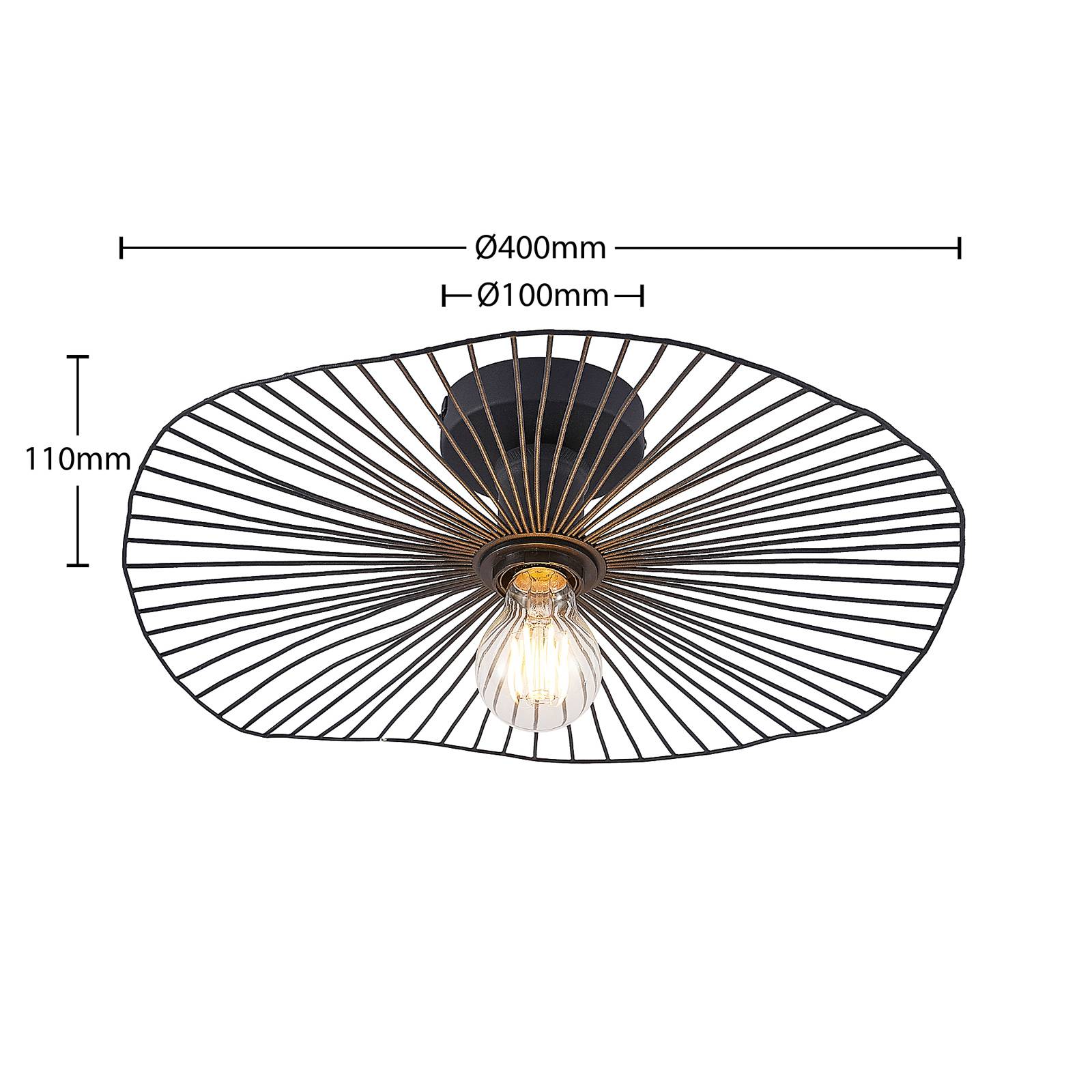 Plafoniera Ruota in metallo dal design irregolare Il design della plafoniera Ruota assomiglia un po' a un cappello da sole schiacciato. La tonalità, che ha quasi la forma di una ruota a raggi ma ondulata, è in metallo e verniciata in nero opaco. La presa per la lampadina, che sporge verso il basso dalla lampada, si trova al centro di questa ruota. La plafoniera Ruota è molto bella quando è dotata di una lampada a globo. Se si utilizza una lampada a globo smerigliato o bianco opale, l'abbagliamento è impedito, e scegliendo una lampada a LED, si può garantire un'illuminazione molto efficiente dal punto di vista energetico.