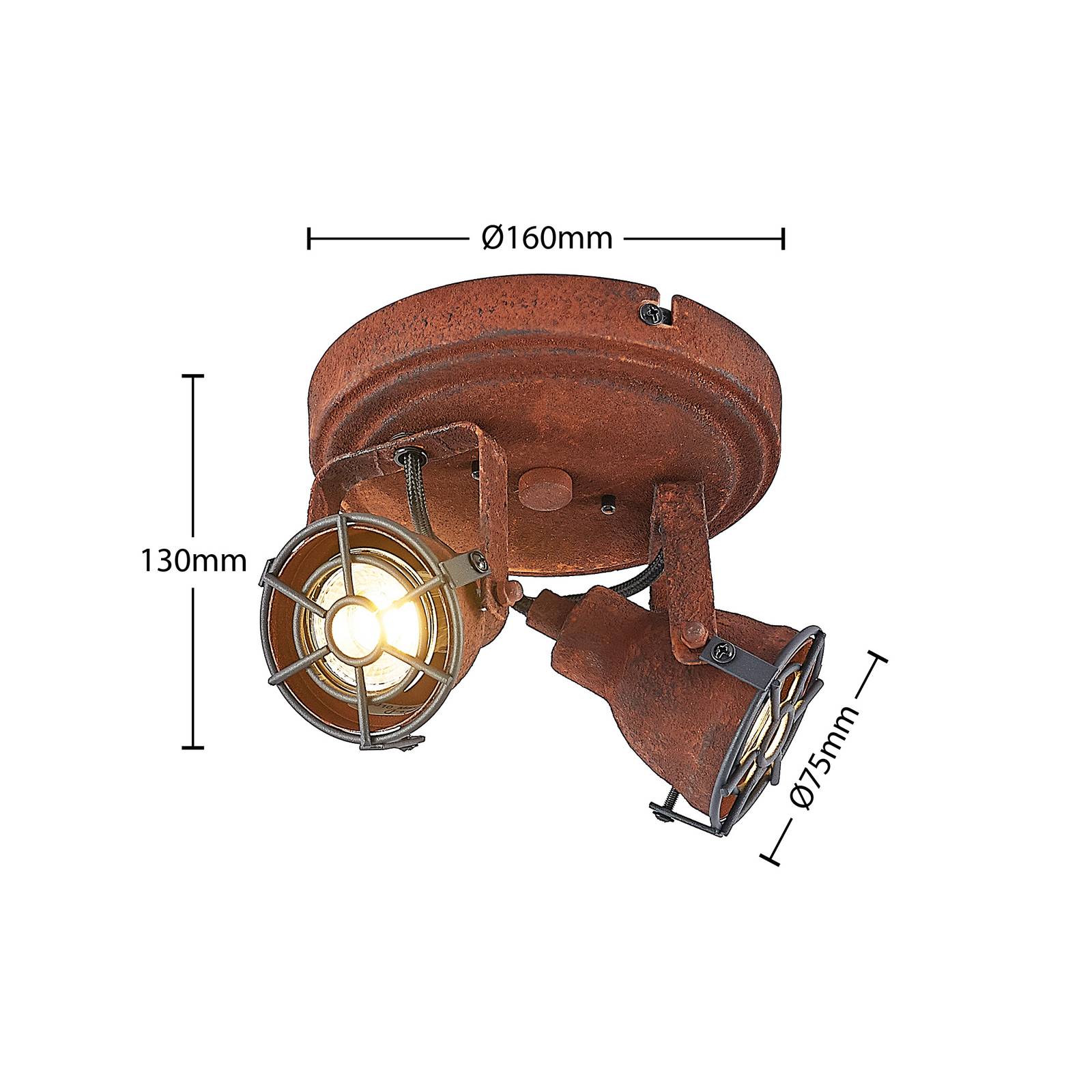 In ottica ruggine progettato, faretto a soffitto a due fiamme Scabra Il faretto a soffitto a due fiamme Scabra sembra una reliquia di una vecchia fabbrica. Completamente progettata in un look arrugginito, la plafoniera porta il fascino industriale di tendenza nella stanza. I due punti girevoli e girevoli, fissati in una staffa sulla calotta rotonda, consentono flessibilità nella radiazione luminosa. In contrasto con l'aspetto arrugginito del faretto, possono essere dotati di moderne lampade a LED.