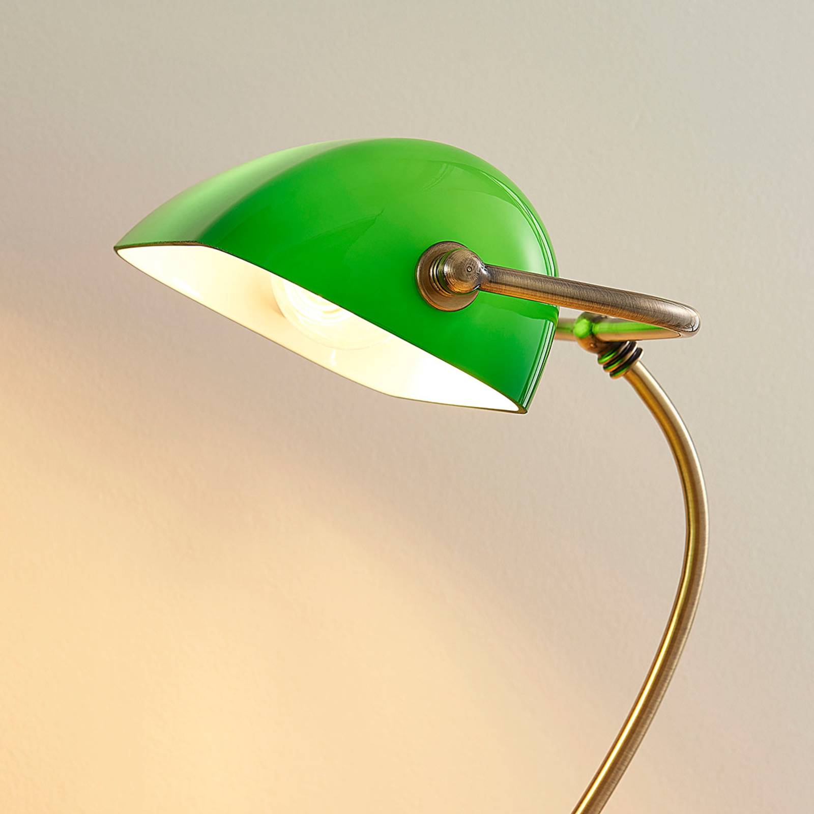 Lampada da scrivania cult: la lampada da banca Selea con paralume in vetro verde La lampada da banca Selea, formata da un paralume in vetro verde e una struttura di metallo color ottone antico, ricorda le lampade che si usavano all'inizio degli anni '20 per le scrivanie dei centri finanziari delle grandi città, come Wall Street a New York. La luce, trattenuta dal paralume in vetro verde, si concentra sulla superficie del tavolo e fa di questa lampada un sistema d'illuminazione ideale per la lettura e il lavoro alla scrivania. Nel cavo di alimentazione lungo 180 cm è integrato l'interruttore di accensione. Per un look ancora più autentico, si raccomanda l'impiego di lampadine LED a filamento, che riproducono alla perfezione le vecchie lampadine a incandescenza, ma che consumano meno corrente.