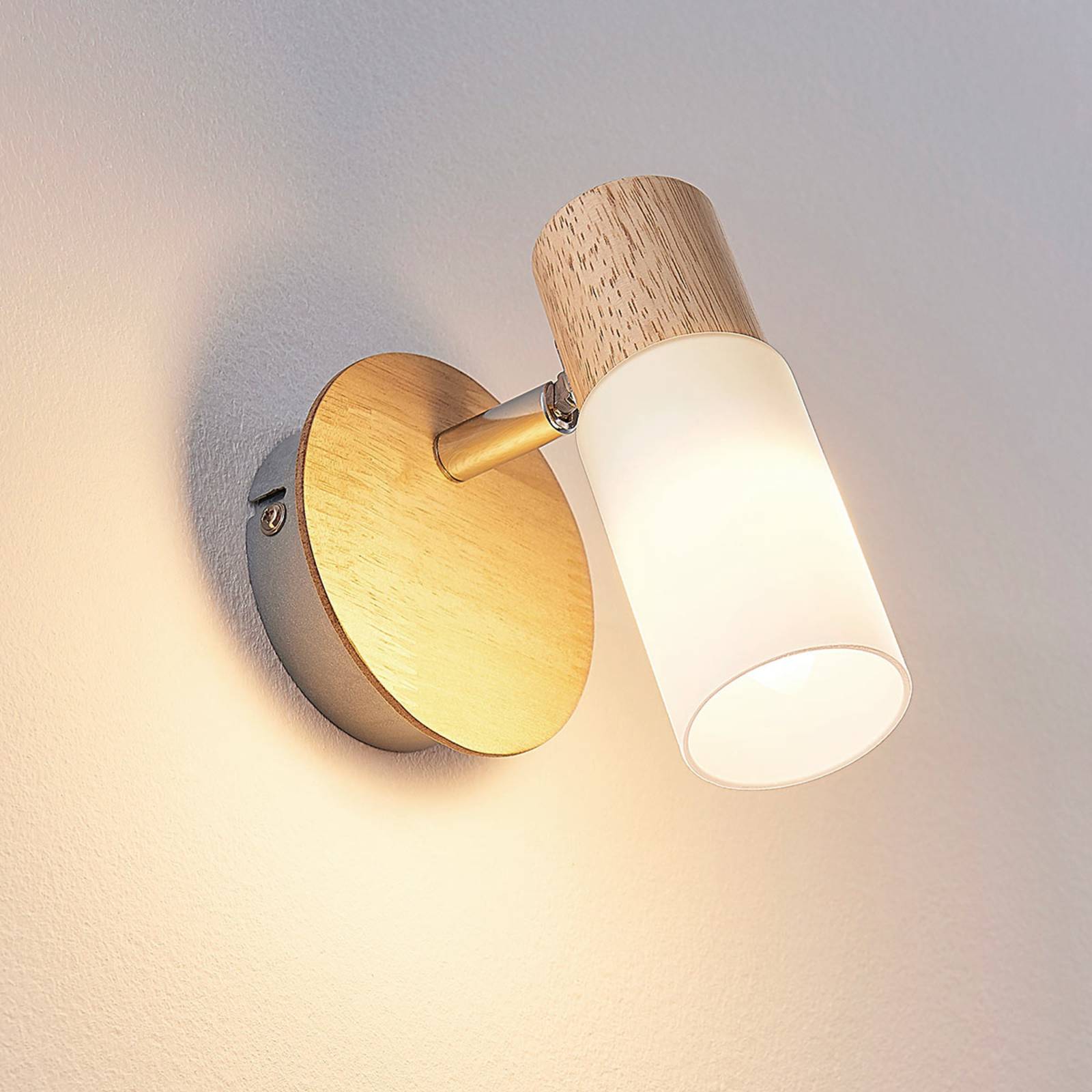 Faretto Christoph con paralume in legno e vetro cilindrico Questo faretto in legno convince per il suo design accattivante. Il paralume cilindrico in vetro bianco distribuisce la luce in modo particolarmente morbido, per questo il faretto è molto adatto a illuminare gli spazi abitativi. Christoph può essere montato non solo a parete, ma anche come faretto a soffitto. Il decoro in legno sulla staffa e come estensione del paralume in vetro crea un'aura calda e naturale