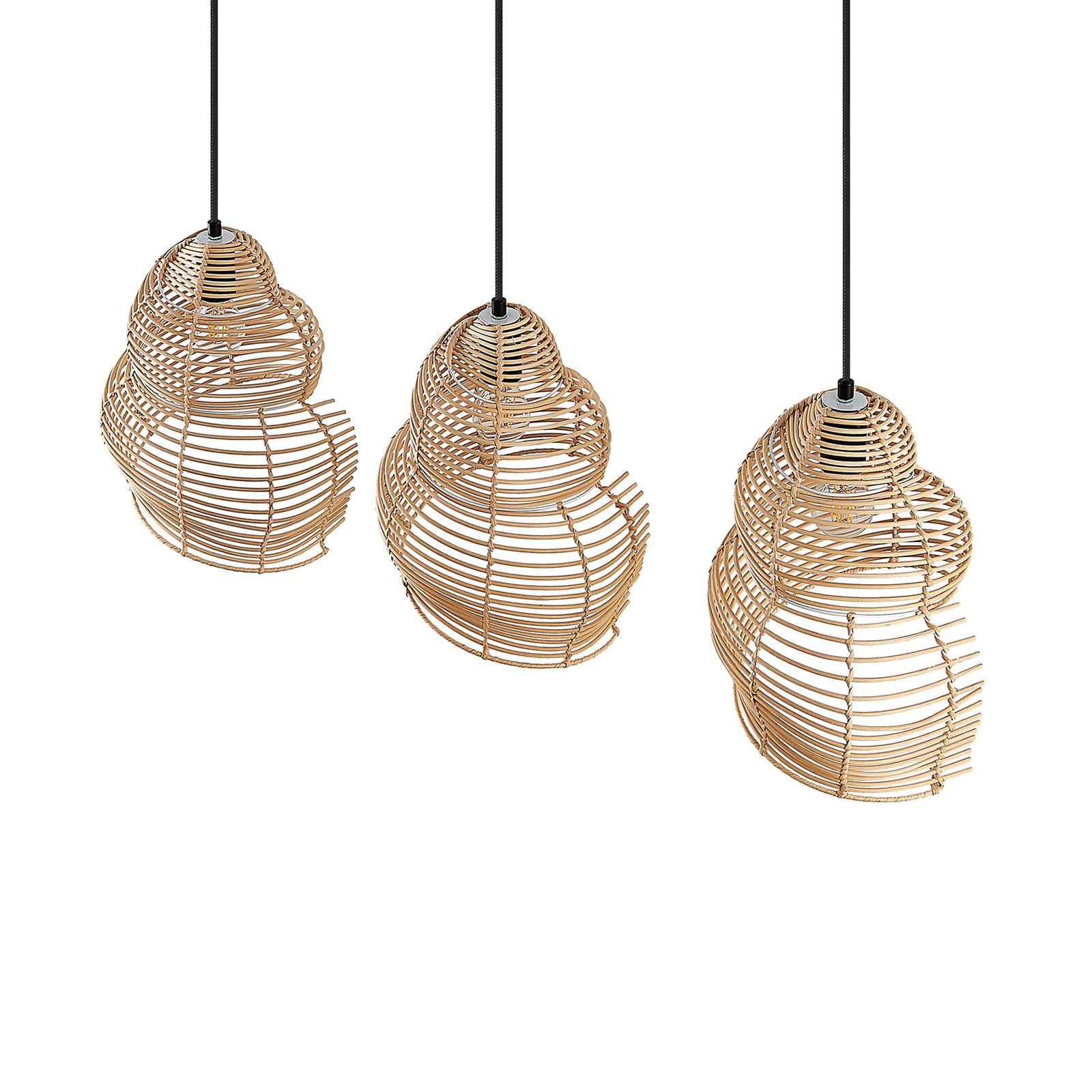 Lampada a sospensione Taspira dal design fantasioso in vimini naturale La lampada a sospensione Taspira convince su tutta la linea per il suo design fantasioso che combina acciaio robusto ed elementi naturali. L'apparecchio a soffitto in acciaio è progettato in nero opaco e forma un elegante contrasto con i tre insoliti paralumi, che sono in primo piano nel design. Sono realizzati in vimini naturale e hanno la forma di conchiglie, molto insolita e affascinante allo stesso tempo. Questa lampada naturale sta molto bene sopra il tavolo della sala da pranzo o anche sopra il bancone della cucina e attirerà sicuramente gli sguardi curiosi.