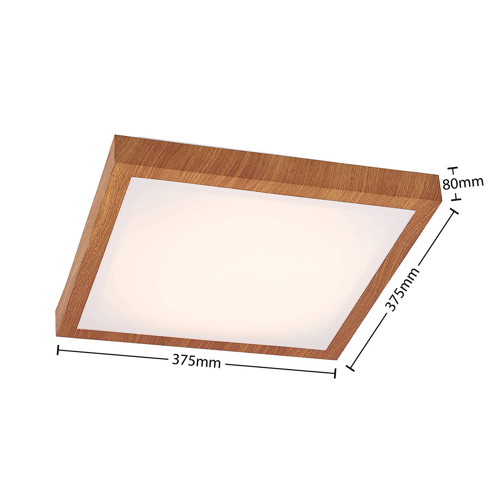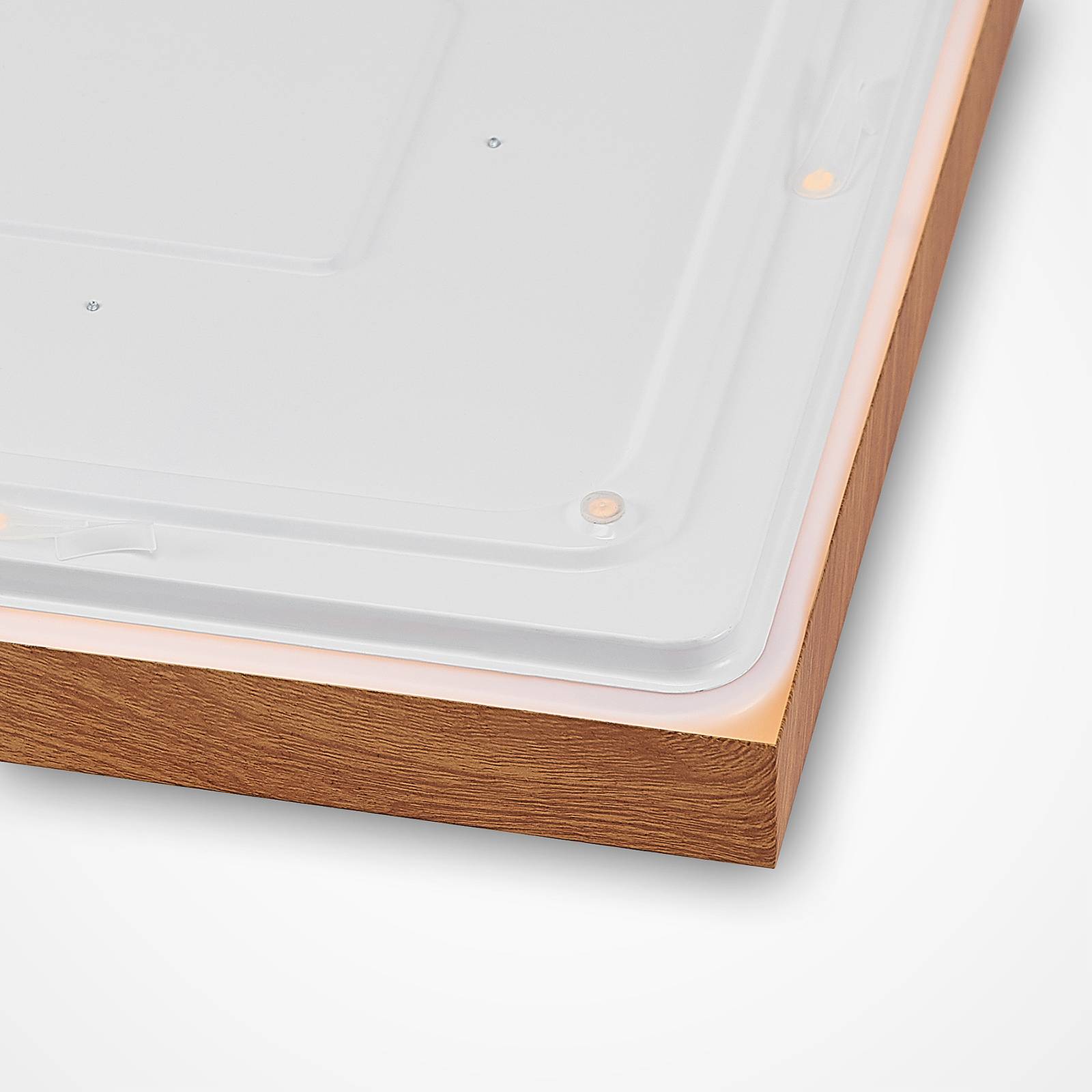 Lampada da soffitto a LED Vaino dal carattere moderno e dal design angolare con finitura in legnoLa lampada da soffitto a LED Vaino convince per il suo aspetto discreto ma elegante, che fa la sua super figura soprattutto in uno studio o in una camera da letto. Il suo corpo lampada angolare si appoggia direttamente al soffitto e si presenta con una finitura armoniosa che sembra legno. Il quadrato interno è realizzato in plastica e mantenuto in bianco, dietro al quale si trovano LED installati in modo permanente che producono una luce bianca calda. Nella stanza si crea un ambiente accogliente. Il design sottile della plafoniera LED Vaino si adatta anche ai soffitti più bassi e consente di risparmiare spazio rispetto a una plafoniera sporgente. La sua combinazione di colori discreta ma dai toni caldi si integra senza sforzo negli stili di arredamento moderni e si fonde facilmente con il resto dei mobili senza sovrastarli.