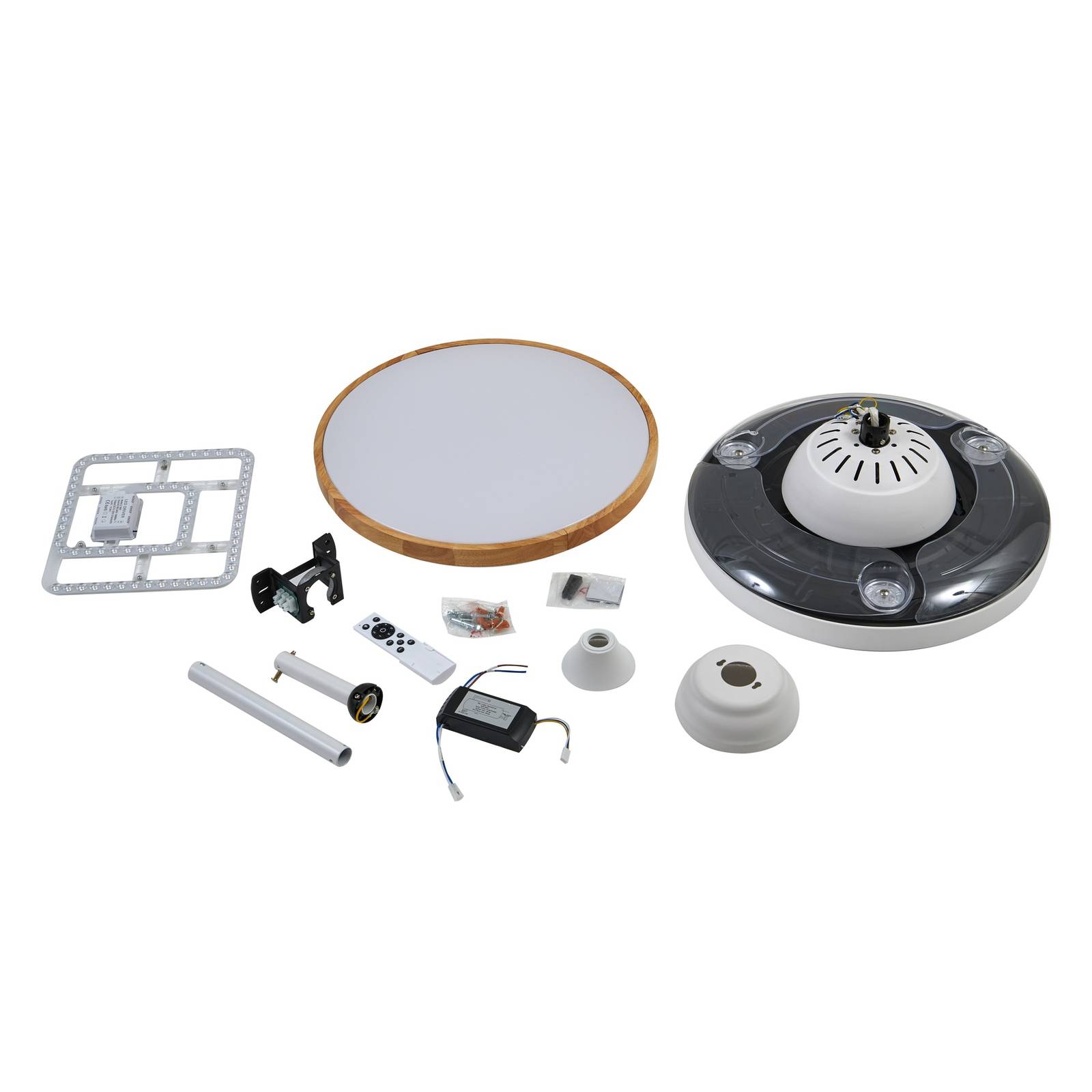 Ventilatore da soffitto Oras LED rotondo e moderno con colore di luce regolabile Quando è spento, il ventilatore da soffitto Oras LED sembra una semplice luce. La luce viene emessa nell'ambiente attraverso il grande diffusore rotondo e può essere impostata su tre diversi colori di luce con diversi flussi luminosi tramite il telecomando. Le pale in plastica trasparente sono nascoste sopra la testa e si ripiegano non appena il ventilatore viene acceso. La combinazione del bianco, delle pale trasparenti e del dettaglio dell'anello color legno, che incornicia la fonte di luce tutt'intorno, conferisce al ventilatore da soffitto un aspetto molto moderno. La funzione integrata di marcia avanti e retromarcia ne consente l'utilizzo sia in estate che in inverno. Il telecomando in dotazione permette di controllare il colore di luce e i vari livelli di velocità, nonché di impostare un timer. Il motore a corrente continua integrato garantisce inoltre un funzionamento silenzioso. Dettagli tecnici - Colore di luce regolabile in tre fasi (3.000 K / 1.670 lm, 4.000 K / 2.000 lm, 6.500 K / 1.700 lm).700 lm) Potenza per velocità: - 40 watt a 225 giri/min - 22 watt a 180 giri/min - 4,9 watt a 140 giri/min - Dimensioni ottimali della stanza: 9-10m² - Portata massima: 96,96 m³/min - Velocità massima dell'aria: 2,946 m/sec - Livello di potenza sonora del ventilatore: 47 dB (A) - Valore di servizio (SV): 3,81 (m³/min)/W - Il telecomando richiede 2 batterie NiCa AAA