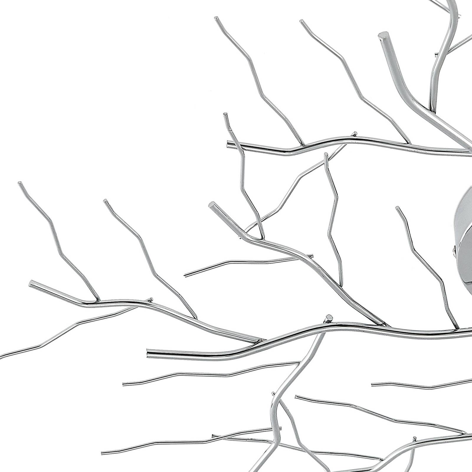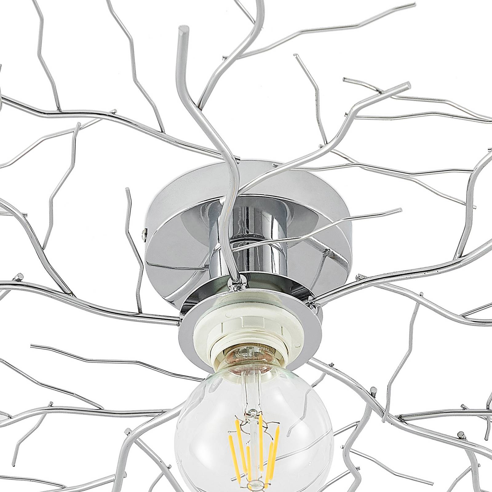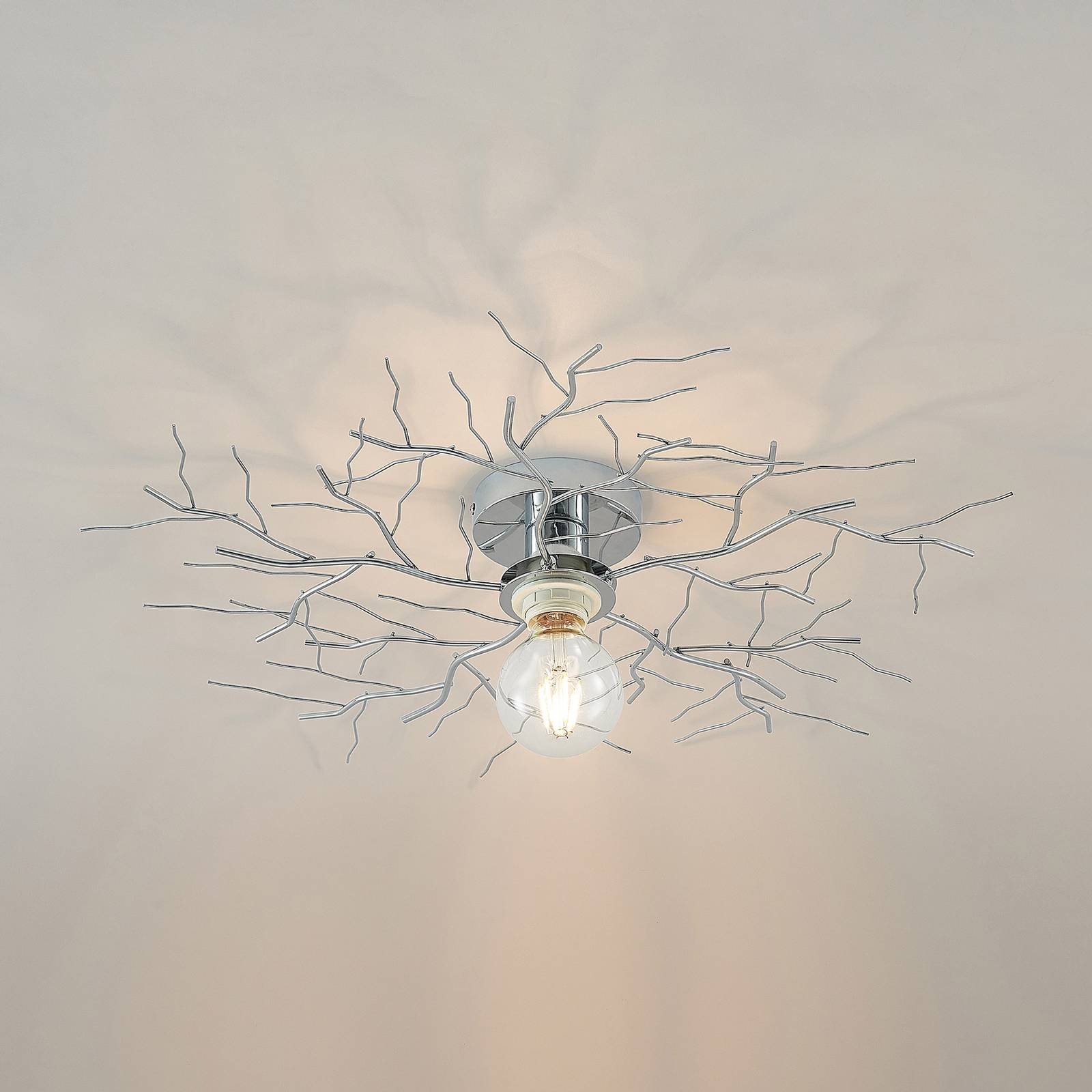 Lampada da soffitto design-oriented Vetki in cromo moderno La lampada da soffitto Vetki colpisce per il suo aspetto insolito, che porta un tocco naturale agli interni. La lampada era fatta di ferro e disegnata in un cromo alla moda. La lampadina E27 da utilizzare può essere scelta liberamente dall'utente ed è chiaramente visibile da tutti i lati grazie al design senza ombre, in modo che la luce possa dispiegarsi liberamente e uniformemente nella stanza.