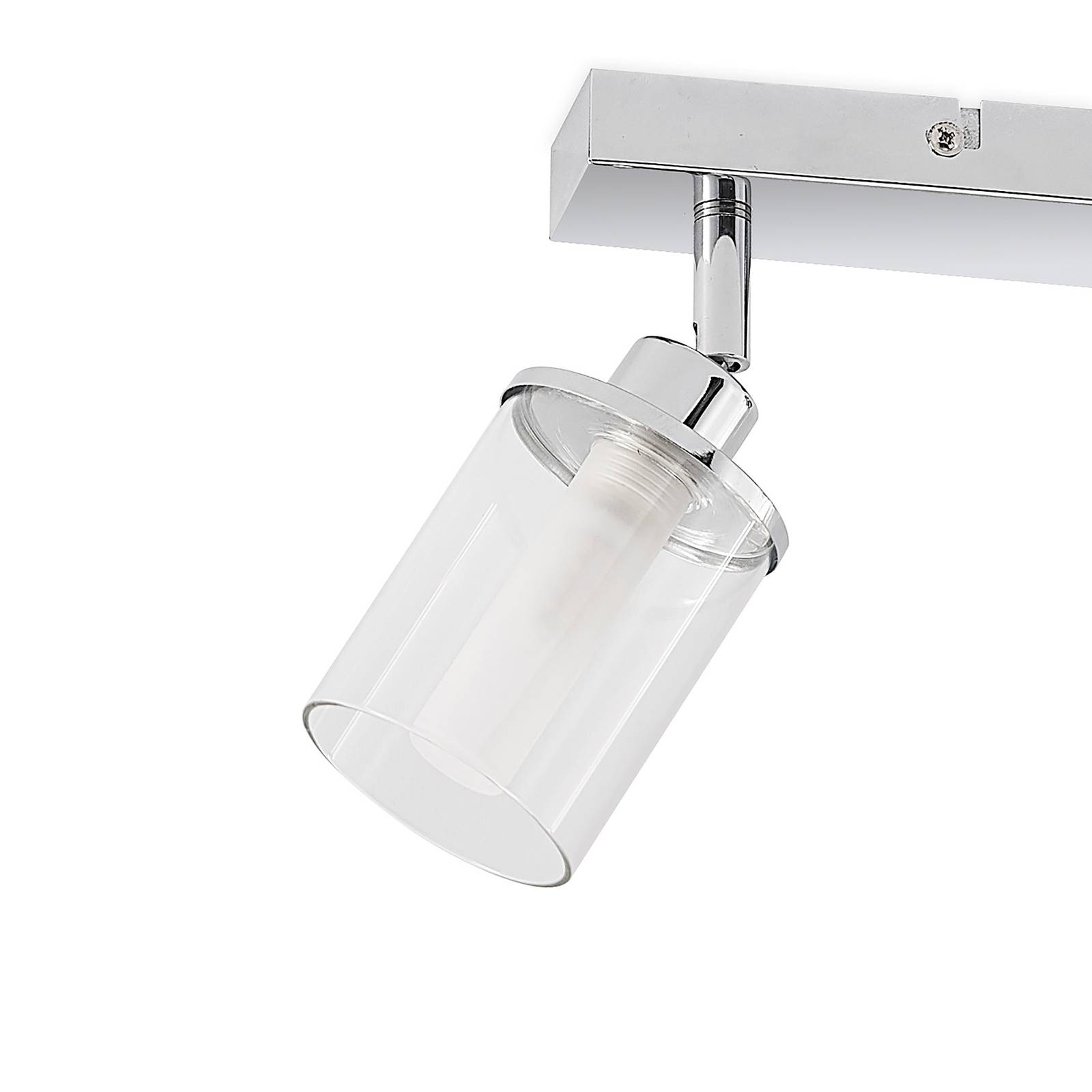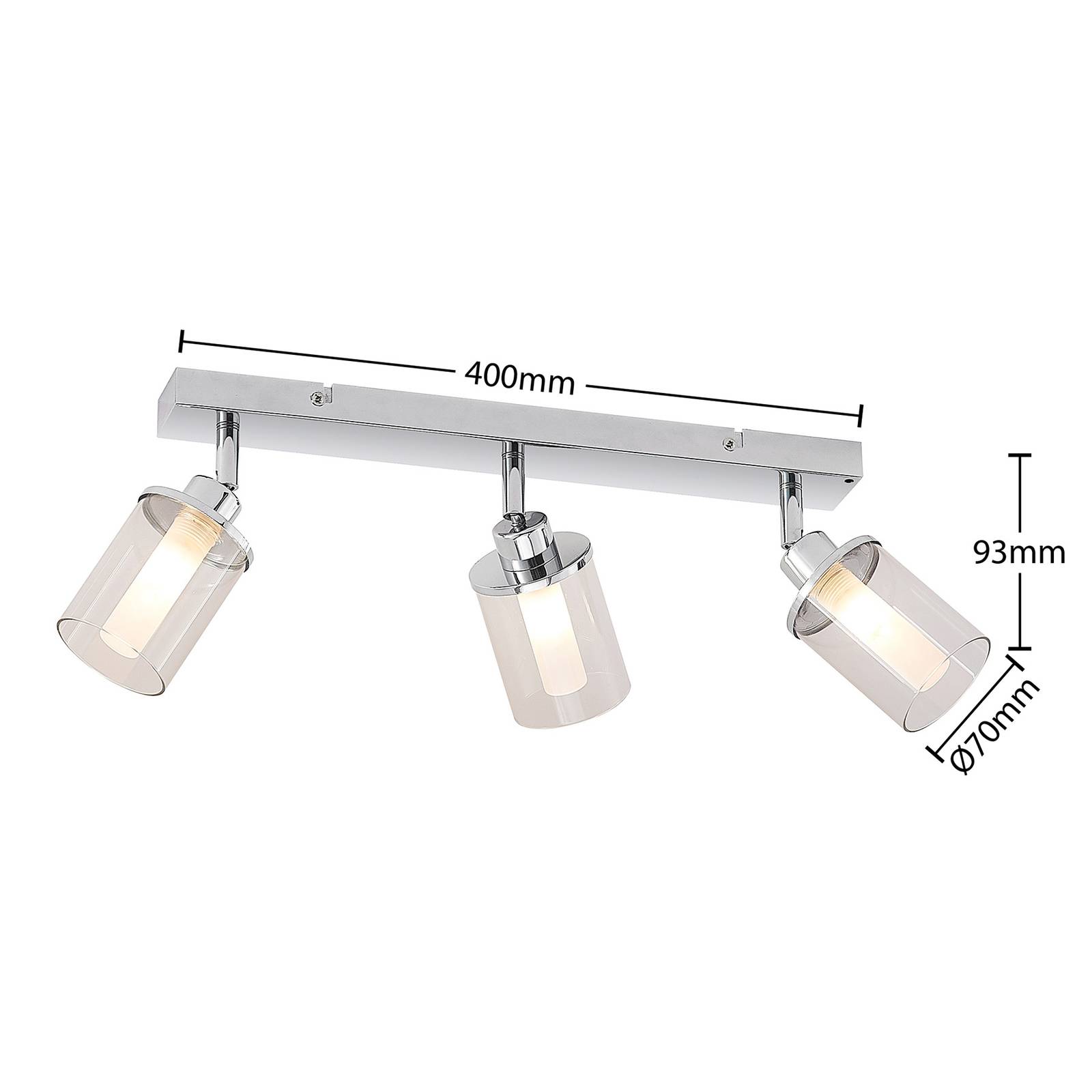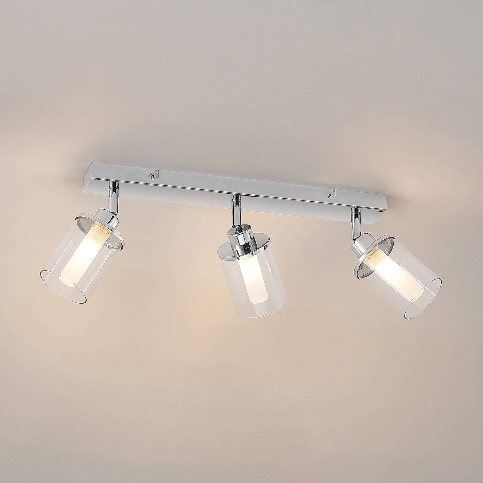 Faretto da soffitto Vinza a 3 luci con doppio paralume in vetro Vinza è realizzato in acciaio e vetro e si presenta in un colore cromato neutro. I tre paralumi si distinguono per il loro design, in quanto presentano un paralume esterno trasparente e un paralume interno cilindrico opalino. Questo faretto da soffitto si inserisce perfettamente in uno Schöner Wohnen o in una camera da letto e può anche essere un'attrazione in un corridoio.