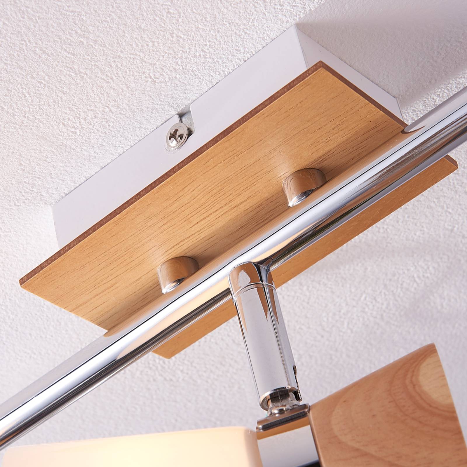 Lampada Vivica di effetto naturale, con decorativi elementi di legno Vivica sa portare un tocco di naturalezza in ogni ambiente di casa, sia esso il salotto, la camera da letto o il corridoio. Infatti è costruita con diversi dettagli di legno chiaro, visibili sia sugli schermi che sul supporto. Il legno presenta una bella venatura naturale che dà ulteriore calore all'ambiente. Ogni singola testata è provvista di uno snodo con cui si possono ruotare e inclinare gli schermi in modo da puntare la luce nella direzione preferita. Sui portalampada E14 si possono fissare sorgenti luminose di ogni tipo, comprese le efficientissime lampadine a LED.