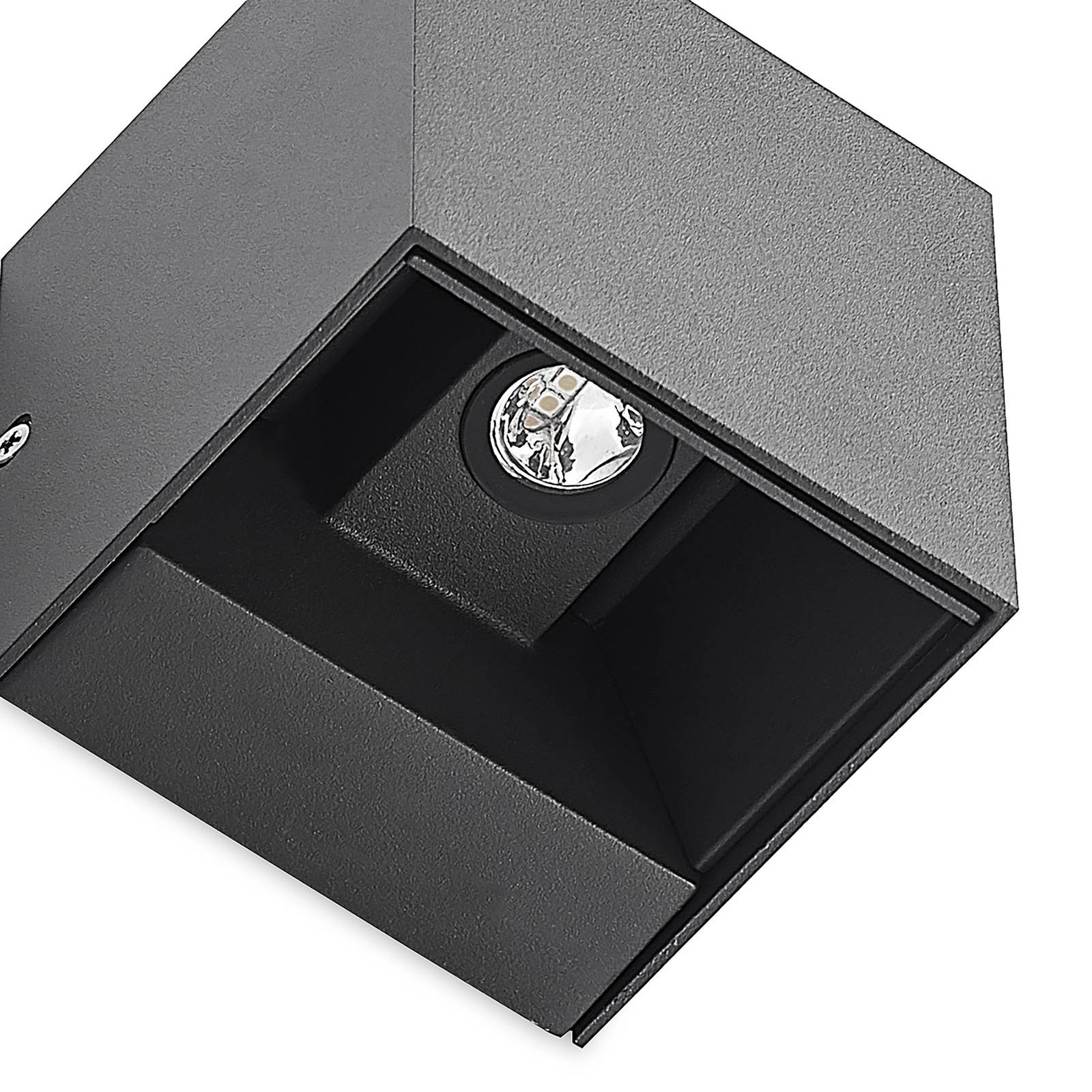 Zavir, applique da esterno angolare a LED in alluminio di colore grigio scuro Zavir ha un design semplice che si integra facilmente nello stile architettonico di una casa. L'applique da esterno a LED è realizzata in alluminio e presenta un colore grigio scuro che le conferisce un carattere semplice. All'interno del suo corpo illuminante sono installati permanentemente dei LED che generano una luce bianca calda e creano un ambiente piacevole. Zavir è protetto dalla polvere e dagli spruzzi d'acqua, con un grado di protezione IP54. Il suo design discreto crea accenti discreti sulle pareti della casa e può essere combinato con altri apparecchi della gamma, a seconda delle necessità, per creare un'impressione complessiva armoniosa.