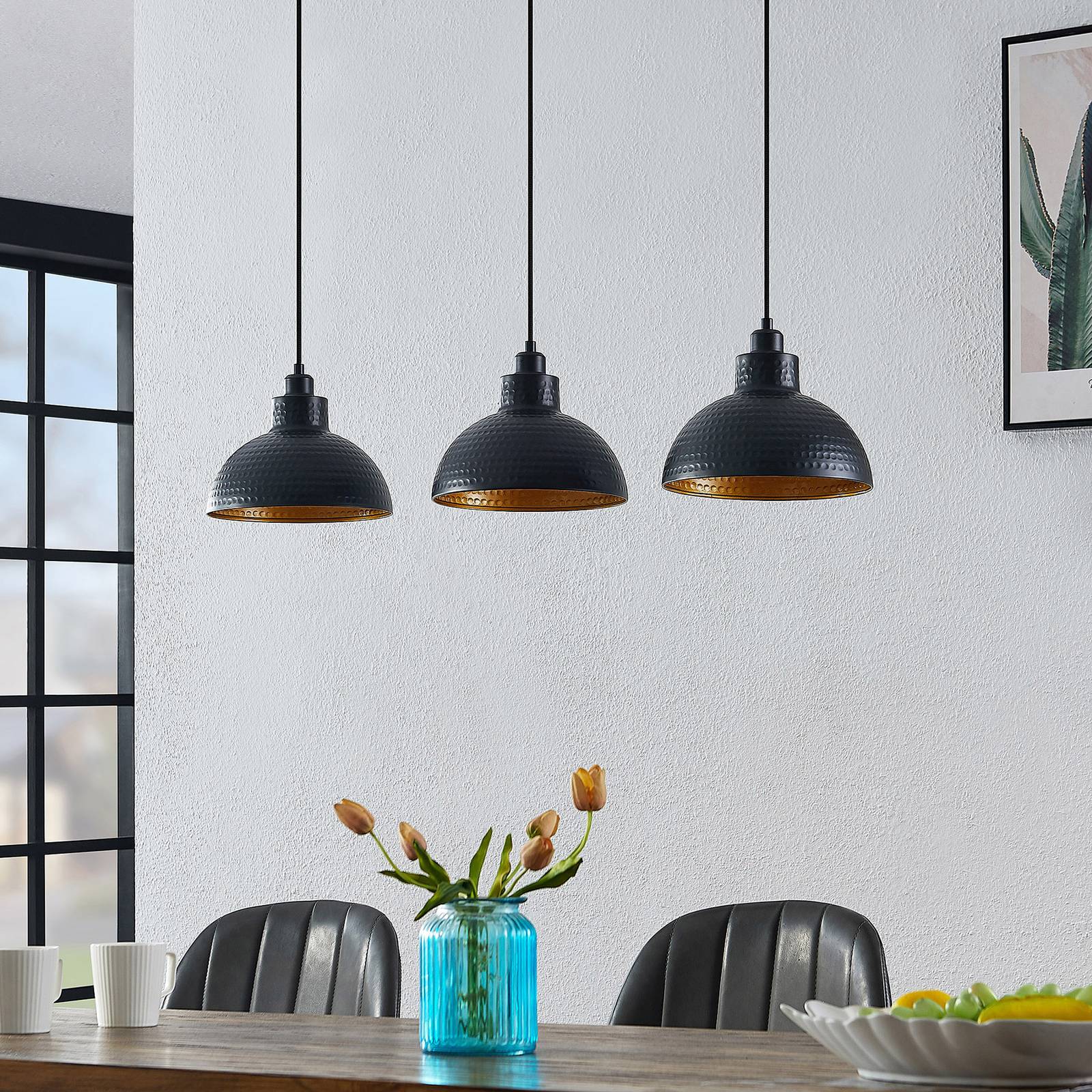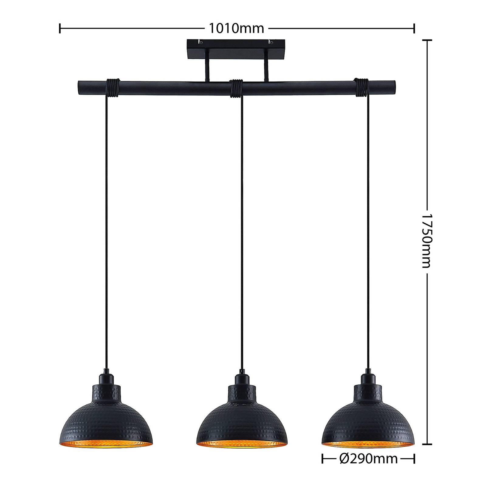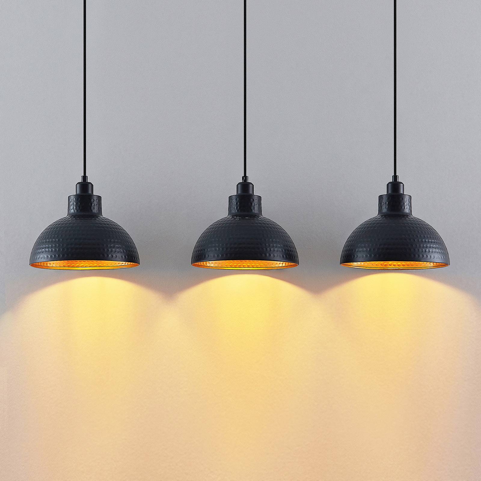 Apparecchio a sospensione a tre lampade Zelotta in nero e oro - illuminazione ideale per la zona pranzo Zelotta non solo riprende la bella tendenza del nero e dell'oro, ma è anche una lampada a sospensione che combina il look martellato e la forma nostalgica in modo accattivante. Un totale di tre paralumi in metallo pendono da cavi in tessuto nero e sono neri opachi all'esterno, mentre l'interno brilla in un bel tono d'oro. In questo modo, non solo si può creare un bel contrasto di colori, ma anche un'immagine di luce dai toni molto caldi, perché la lucentezza della luce viene riflessa così bene dalla tinta dorata. Si raccomanda di usare lampade decorative a filamento per un look coordinato. Nella versione a tre lampade, la lampada a sospensione è molto adatta per illuminare un tavolo in sala da pranzo o un bancone allungato.