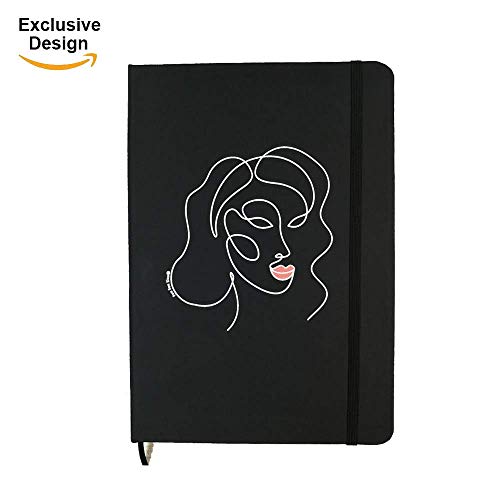Fun Fan Line - Taccuino rigido con chiusura elastica, foglie foderate, doppio segnalibro e tasca posteriore. (Nero, Labbra rosa)