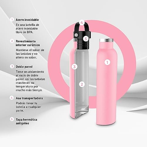 LINEA OPTIMUM OL Bottiglia acqua H2ZEN Acciaio Inox Senza BPA con Rivestimento Interno Ceramica 600 ml Doppio Strato con Vuoto Senza Gusto Metallico (Rosa)