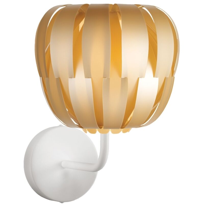 Collezione Queen FORME MAESTOSE E LUSSUOSE Applique moderna a 1 luce realizzata in polilux oro, dotata dotata di braccio in metallo. Composta da 24 strisce, posizionate in modo tale da sovrapporsi parzialmente l'una all'altra, dando un effetto alla luce fortemente espressivo e glamour. Questa elegante lampada iconica si distingue per la sua forma maestosa e lussuosa, che funge da fulcro visivo di ogni stanza e andrà ad illuminare con grazia ed eleganza ambienti moderni e contemporanei. Disponibile in diverse misure e finiture di colore.