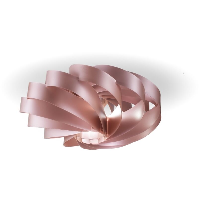 Collezione Flat DELICATA E DISTINTA Lampada da soffitto moderna a 1 luce realizzata in polilux rosa metallico. Linea moderna e leggera, grazie al design minimal della spirale che con l' avvolgersi dei fogli in polilux crea infiniti giri intorno ad un punto, dona all'ambiente armonia ed eleganza. Ben si presta ad illuminare ed arredare il living abitativo o l' ambito commerciale dallo stile moderno e contemporaneo. Disponibile in diverse finiture e molteplici misure. Sorella della collezione Globe, la lampada Flat incarna un ideale matematico di bellezza. Un solido scomposto ma regolare, delicato e distinto.