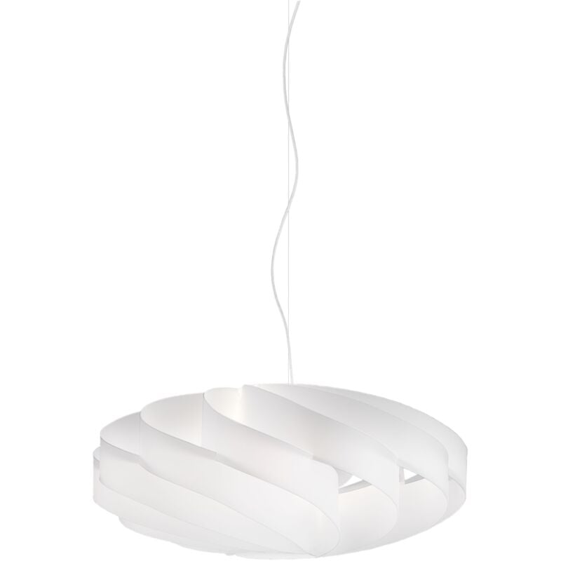 Collezione Flat DELICATA E DISTINTA Sospensione moderna a 5 luci realizzata in polilux bianco, dotata di cavo trasparente di 150 cm e rosone in metallo cromato. Linea moderna e leggera, grazie al design minimal della spirale che con l' avvolgersi dei fogli in polilux crea infiniti giri intorno ad un punto, dona all'ambiente armonia ed eleganza. Ben si presta ad illuminare ed arredare il living abitativo o l' ambito commerciale dallo stile moderno e contemporaneo. Disponibile in diverse finiture e molteplici misure. Sorella della collezione Globe, la lampada Flat incarna un ideale matematico di bellezza. Un solido scomposto ma regolare, delicato e distinto.