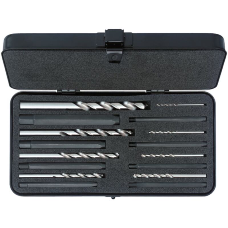 Frase di uscita di avvitazione completamente 16 parti con trapano a spirale per rimuovere viti danneggiate o rotte di tutti i tipi. M 5 a M 16. Set da 16 pezzi incluso trapano a spirale per viti con filetta Outlet con il tasto Ring.