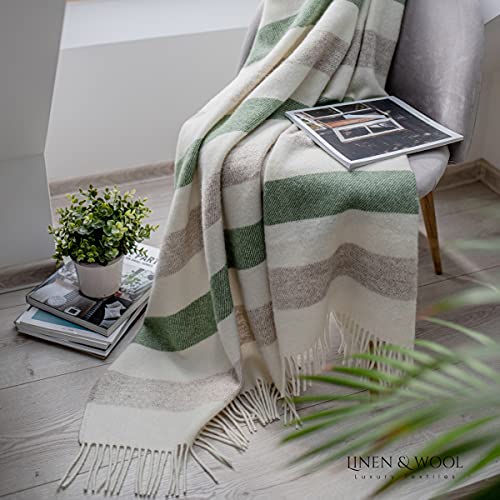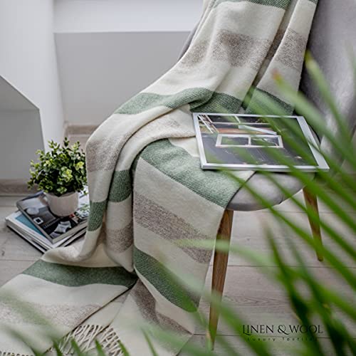 Linen & Cotton Invernale e Caldo Plaid Copriletto Malmo a Righe -100% Pura Lana Neozelandese, Beige Naturale Bianco Verde (140 x 200 cm) Coperta per Divano Letto Singolo Matrimoniale Tutte le Stagioni