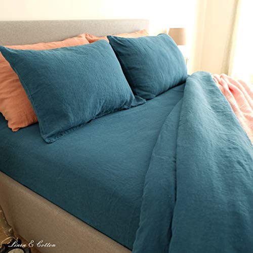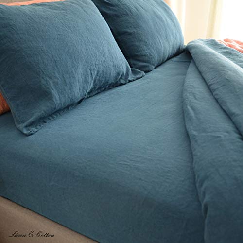 LINEN & COTTON Lenzuolo con Angoli Elasticizzati Molto Morbido in Puro Lino - 100% Lino Lavato (StoneWashed) 180x 200cm (Super King), Blu Petrolio