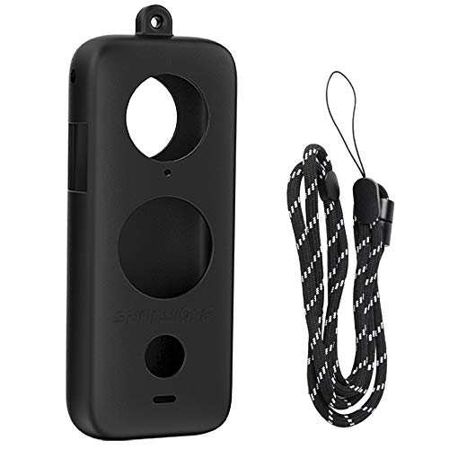 Linghuang Custodia protettiva in silicone per Insta360 One X2 Custodia protettiva antigraffio con copriobiettivo e cinturino da polso (nero, custodia in silicone+copriobiettivo+cordino)...