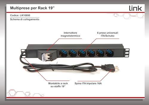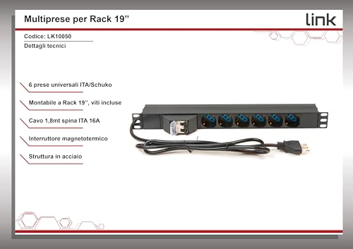 Link LK10050 Multipresa Alimentazione per Rack 19" con 6 Prese Universali Tripolari/Schuko Magnetotermica