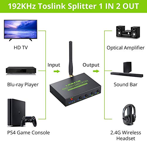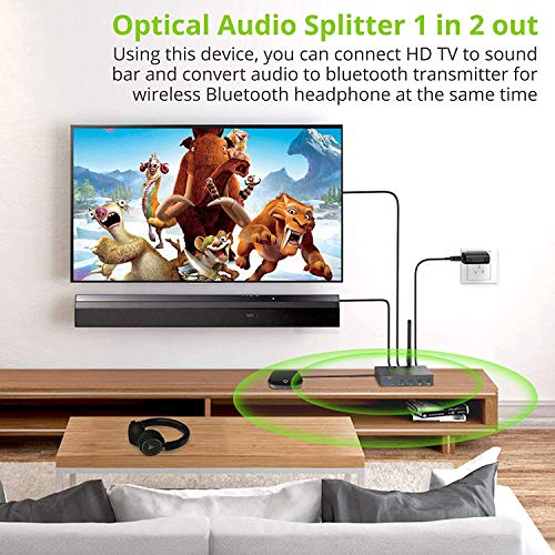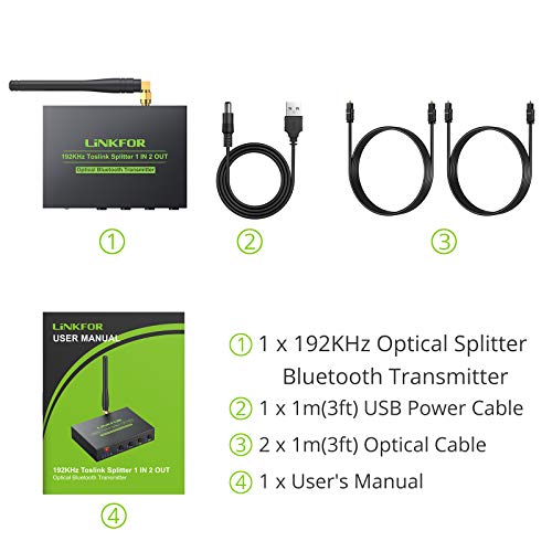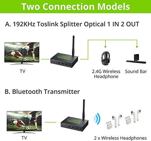 LiNKFOR 192KHz Splitter Ottico Audio 1 IN 2 OUT + Bluetooth 5.0 Trasmettitore Audio Supporta aptX HD e Due Paia di Cuffie Splitter Audio Digitale Supporta Soundbar Set di Auricolari Wireless 2.4G
