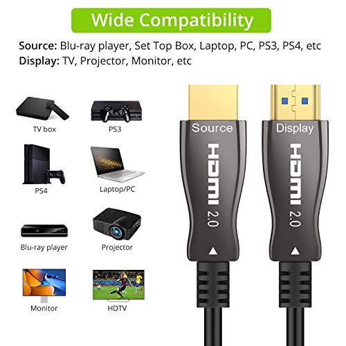 【Elevata Compatibilità】Il Cavo in Fibra Ottica HDMI è una Trasmissione Unidirezionale, il Cavo in Fibra Ottica HDMI Può Collegare Lettori Blu-ray 4K,PS4, PS3, Roku, Laptop a TV 4K, Monitor 4K, Proiezione ecc. *Nota: Deve Essere Installato nella Direzione Corretta: un Cavo con una Presa "Sorgente" per il Collegamento di Dispositivi di Uscita HDMI (Lettori Blu-ray, ST Box, ec