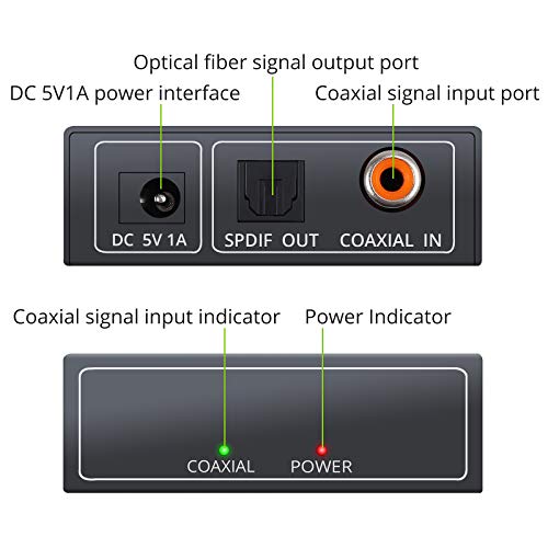 【Plug e Play】Nessuna Necessità di Installare Driver, Facile da Usare. Con il Cavo USB, si Consiglia un Adattatore 5V 1A per Alimentare il Convertitore. Con Cavo Ottico 4.0 da 1 m / 3,3 piedi e Cavo Coassiale da 1,2 m / 3,9 piedi, Comodo da Usare.