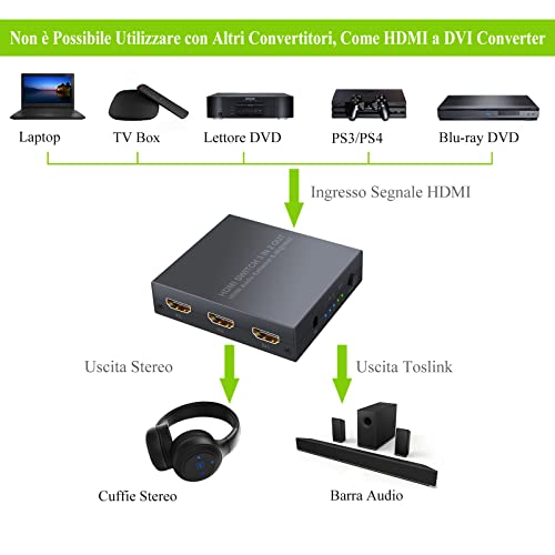 【HDMI Estrattore Audio】 Questo HDMI Estrattore Audio Estrae il Segnale HDMI all'uscita Ottica e all'uscita Audio da 3,5 mm, Disponibile per l'emissione del Suono Tramite la Soundbar e l'amplificatore di Potenza. L'uscita Analogica da 3,5 mm Supporta Audio Stereo 2 Canali, l'uscita Spdif Supporta Audio 2 Canali e 5.1 Canali.