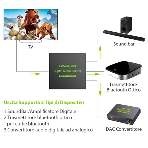 LiNKFOR 3 Porte SPDIF Splitter Audio Digitale Ottico 5.1CH 1x3 Splitter Toslink Supporta Dolby-AC3 DTS LPCM 2.0 con 1M Cavo Ottico per PS3 DAC Convertitore Blu-Ray DVD HDTV STB