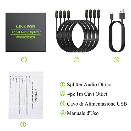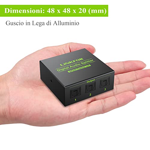 LiNKFOR 3 Porte Splitter Audio Digitale SPDIF 1 In 3 Out Splitter Ottico Toslink Supporta Dolby-AC3 DTS LPCM 2.0 con 4pz 1M Cavi Ottici per PS3 VHS VCR Blu-ray DVD HDTV STB DAC Convertitore
