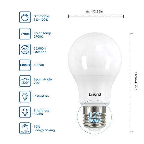 Linkind Dimmerabile Lampadina LED E27, 9W(Equivalenti a 60W), Lampadine A60 Edison 806 Lumen, Luce Bianca Calda 2700k, ERP, Certificazione CE, Pacco da 6