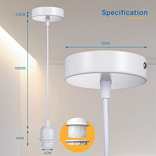 Linkind Portalampada E27 in Metallo, Lampada a Sospensione con Cavo(100CM Altezza Massima Regolabile) e Anello Filettato, Portalampada Compatibile con Paralume(Bianco)