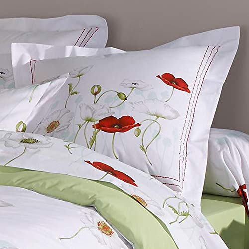 Parure di lenzuola composta da un copripiumino 260 x 240 cm e 2 federe 65 x 65 cm percalle puro cotone pettinato 78 fili/cm² - Reversibile, atmosfera molto elegante con le sue note fiorite alle primacon di campi di papaveri, colori rosso e verde su sfondo bianco