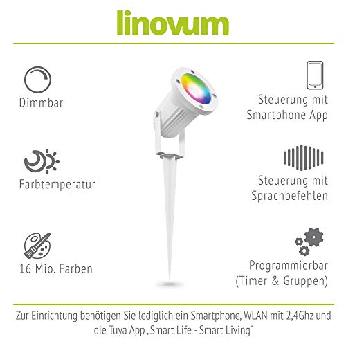 Linovum CARI Faretto da giardino bianco con LED RGBW Smart GU10 - compatibile con Alexa & Google Home WLAN App - Faretto esterno con cavo