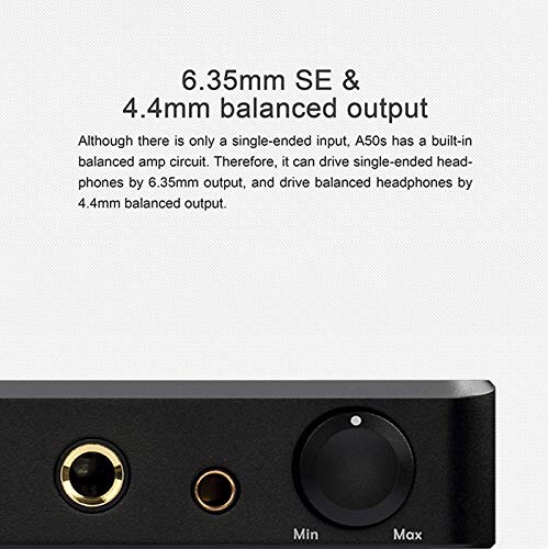 6,35 mm SE & 4,4 mm Uscita bilanciata e cassa in alluminio. A50s ha un circuito amplificatore bilanciato integrato. Pertanto, può guidare cuffie single-ended da 6,35 mm di uscita e guidare cuffie bilanciate da 4,4 mm di uscita bilanciata. Inoltre, A50s utilizza cassa in alluminio pieno con lavorazione unica. L'involucro esterno è costituito da un mattone di alluminio attraverso la lavorazione di precisione CNC. È progettato con colonna conduttiva termica per dissipare il calore dall'alimentazione elettrica e OP-AMP attraverso l'intero involucro esterno