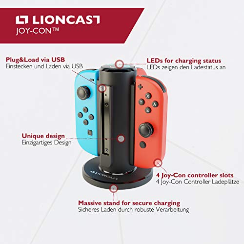 Lioncast Base de Carga para Joy-con - Dock de Carga para 4 Mandos - Compatible con Los Controles de Nintendo Switch - Luces Indicadoras de Estado de Carga, Fondo Fuerte - Accesorios de Juego