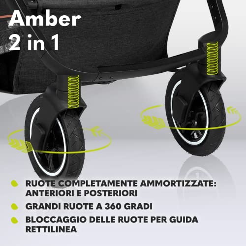 SEDILE E SCHIENALE: Il passeggino Amber consente di montare il sedile rivolto in avanti o all'indietro. Lo schienale è reclinabile in 3 livelli, dalla posizione seduta a quella sdraiata. Il poggiapiedi può anche essere impostato in 3 comode posizioni, garantendo un viaggio confortevole per un neonato.