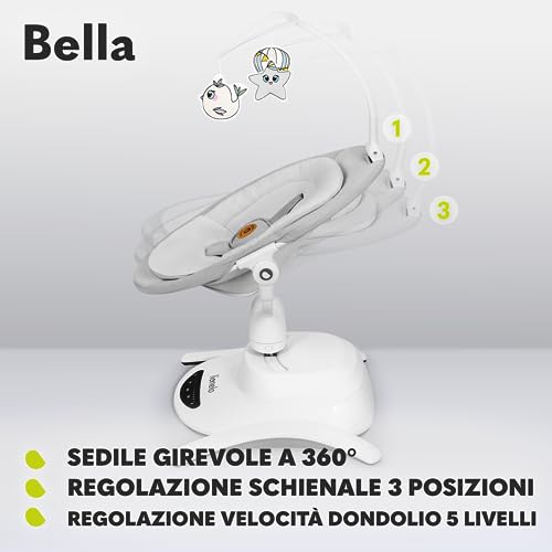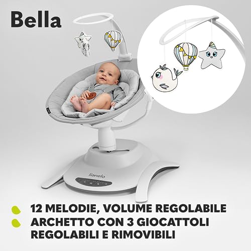 LIONELO Bella 360 Sdraietta dondolo per neonato fino a 9 kg Altalena eletrica con 12 melodie programmate, Telecomando, Culla 5 velocità, Blocco, Regolazione dello schienale, Timer, Silenzioso