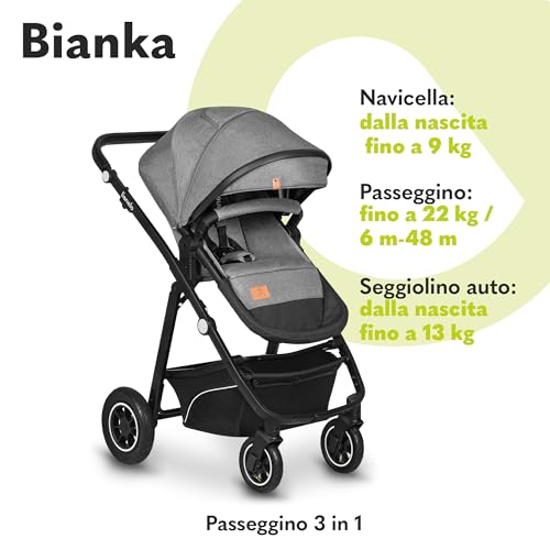 LIONELO Bianka Passeggino 3in1 per Bambini da 0 a 48 mesi Sistema Modulare con Seduta Secchiello, Navicella + Ovetto Neonato, Leggero, Pieghevole, Ruote Grandi per Città e Campagna, Cappottina XXL