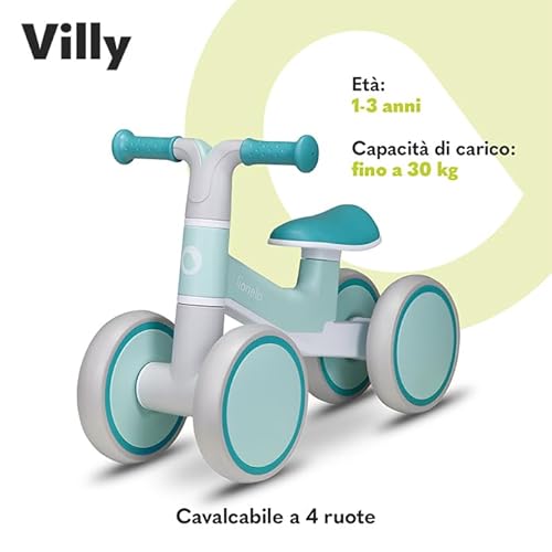 Lionelo VILLY Lightweight Balance Bike for Safe and Fun Adventures, for Boys and Girls Ages 1-3 (max 30kg) 4-Wheel Stability, Front Fork Suspension, Ergonomic Seat (VILLY, TURQUOISE)