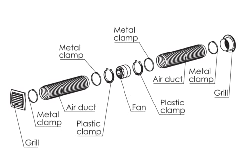 Il kit di sfiato include: 100 mm / 4" ventilatore in linea per il bagno, canalina flessibile da 3 m, griglia esterna e interna, morsetti di fissaggio