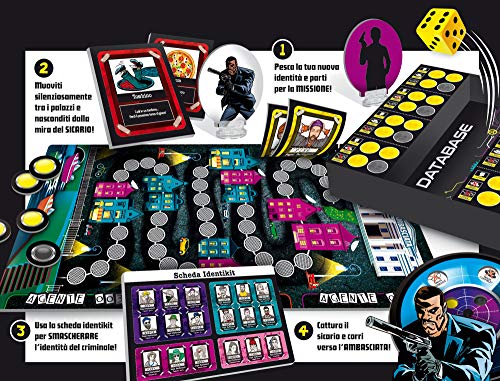 Plancia di gioco, scheda Identikit, 4 segnaposti con card stand, carte personaggio, carte caratteristica, carte imprevisto, dado, gettoni led, disco decodificatore, database, manuale di gioco