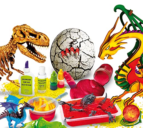 Colla mucosa, attivatore, colorante, vasca T Rex scheletro, uovo da scavare, drago, da assemblare, amuleto, cordoncino dorato, libretto di istruzioni illustrate (lingua italiana non garantita)