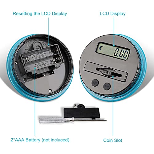 DISPLAY LCD DESIGN: C'è un display LCD sul coperchio del salvadanaio elettronico, che può contare tutte le monete in euro e visualizzare con precisione l'importo totale di ogni deposito, il design trasparente ricorda quanto spazio è rimasto, permettendo ai bambini di godersi il divertimento di risparmio di denaro, alimentato da batterie AAA da 1,5 V (non incluse)