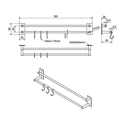 Listello di gancio TALIDA acciaio inossidabile autoadesivo con 3M dischetto autoadesivo (Lunghezza: 585 mm/Ø dell'asta 12 mm) incluso 3 S-ganci per cucina e bagno attaccapanni di SO-TECH®